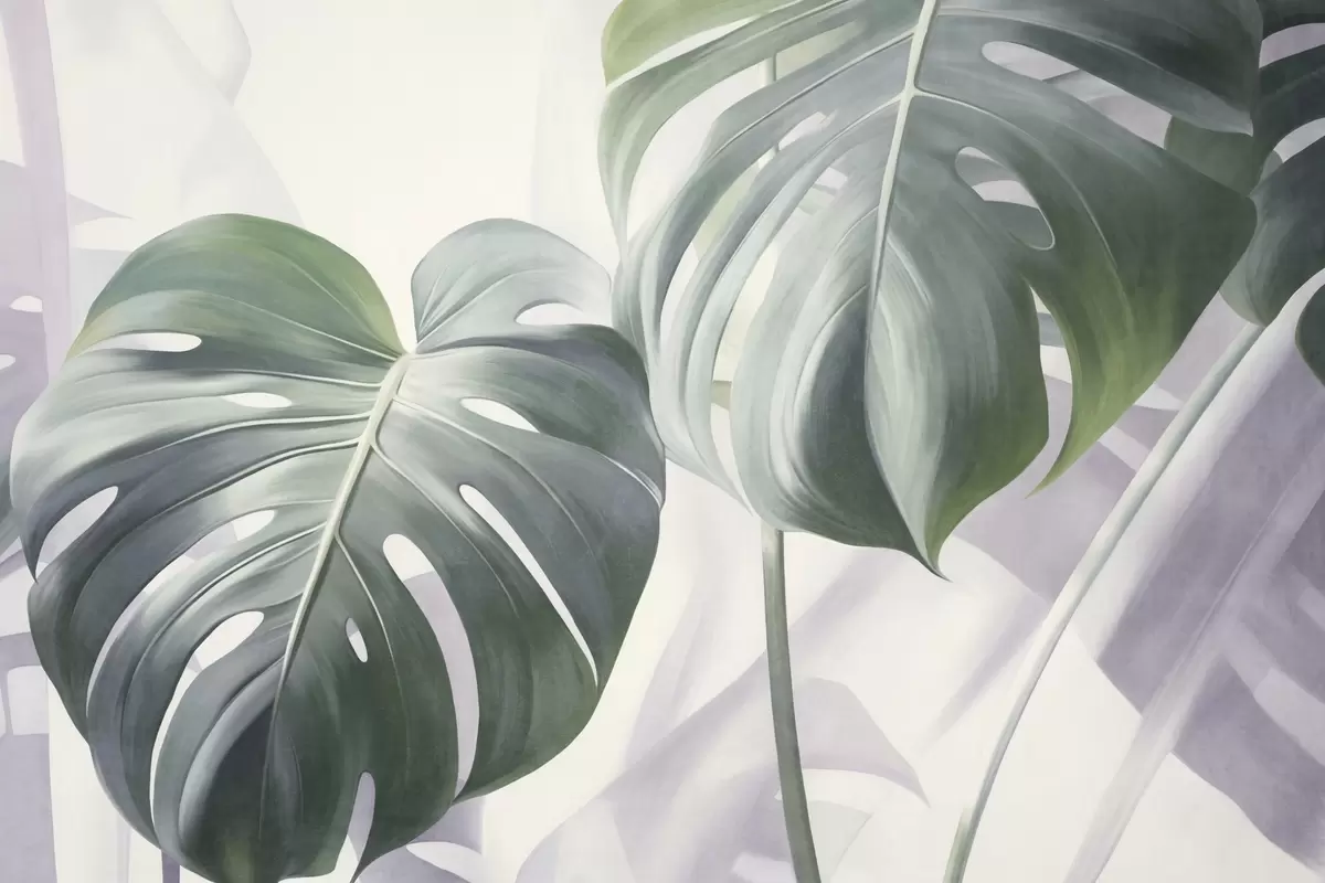 Carta da parati Foglie di monstera grandi e verdi, con texture, su uno sfondo astratto morbido e chiaro nr. w09477