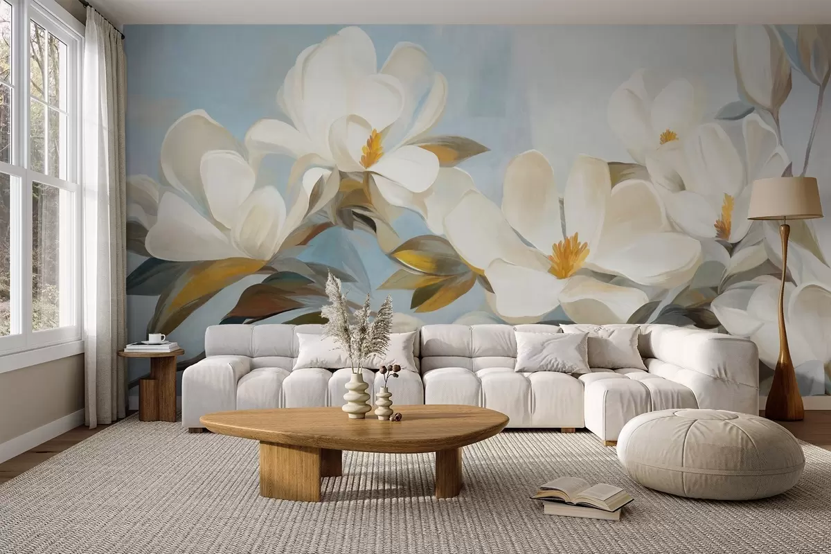 Carta da parati Magnolie bianche con foglie verdi su sfondo azzurro con pennellate astratte imitazione nr. w09478