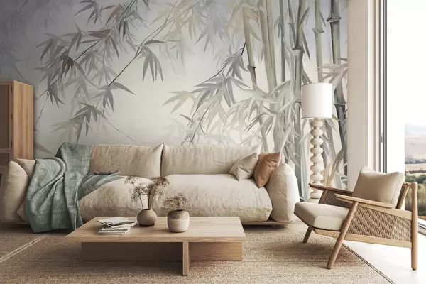 Carta da parati Gambi e foglie di bambù testurizzati in una palette di colori tenui e delicati, quali grigio, bianco e crema, composizione minimalista nr. w09485