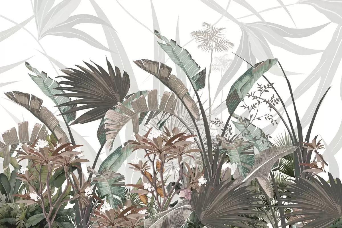 Carta da parati Foglie tropicali con fiori, palme, fiori di plumeria, colori pastello, sfondo bianco, giungla nr. w09488