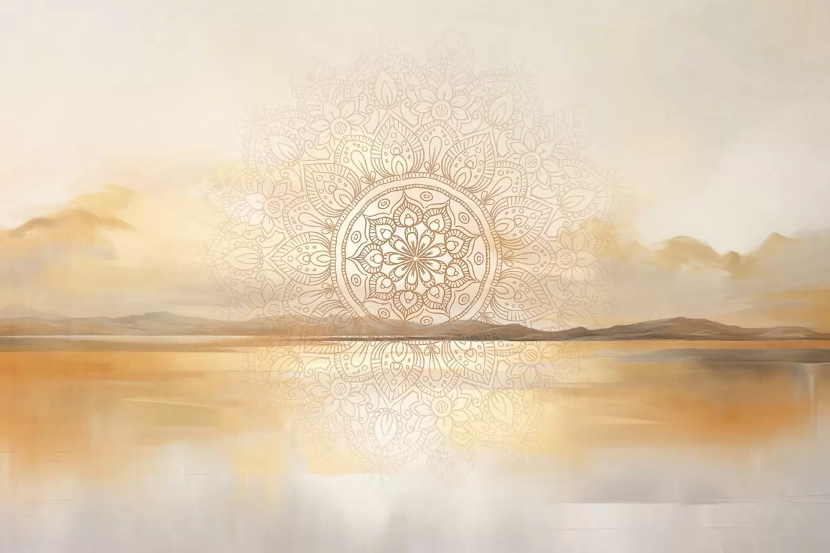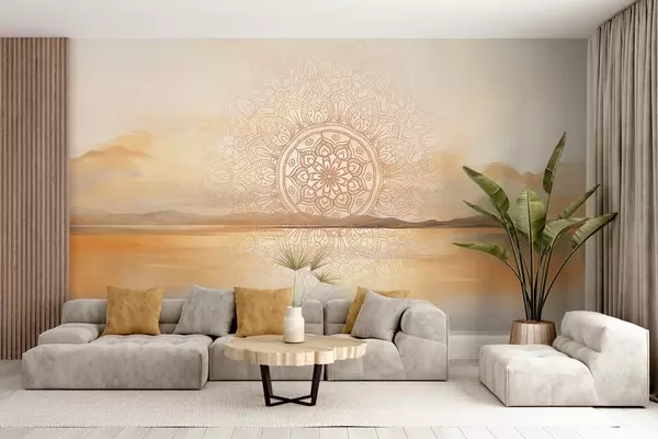 Carta da parati Disegno mandala simmetrico e strutturato che sovrappone un paesaggio con mare, colline e cielo, colori pastello tenui nr. w09491