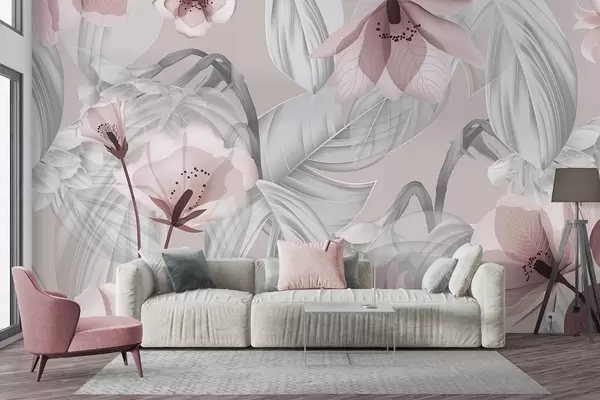 Carta da parati Fiori rosa e foglie grigie, sfondo botanico floreale, design elegante, colori tenui, dettagli delicati e leggeri nr. w09497