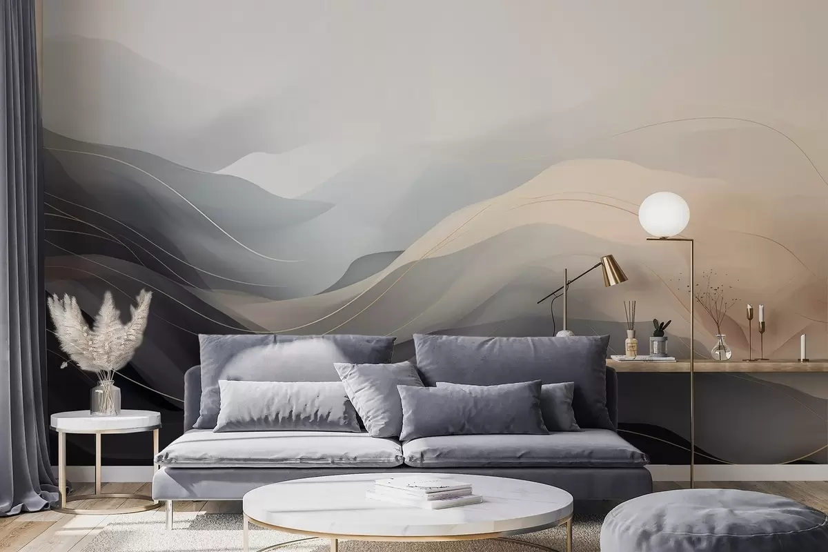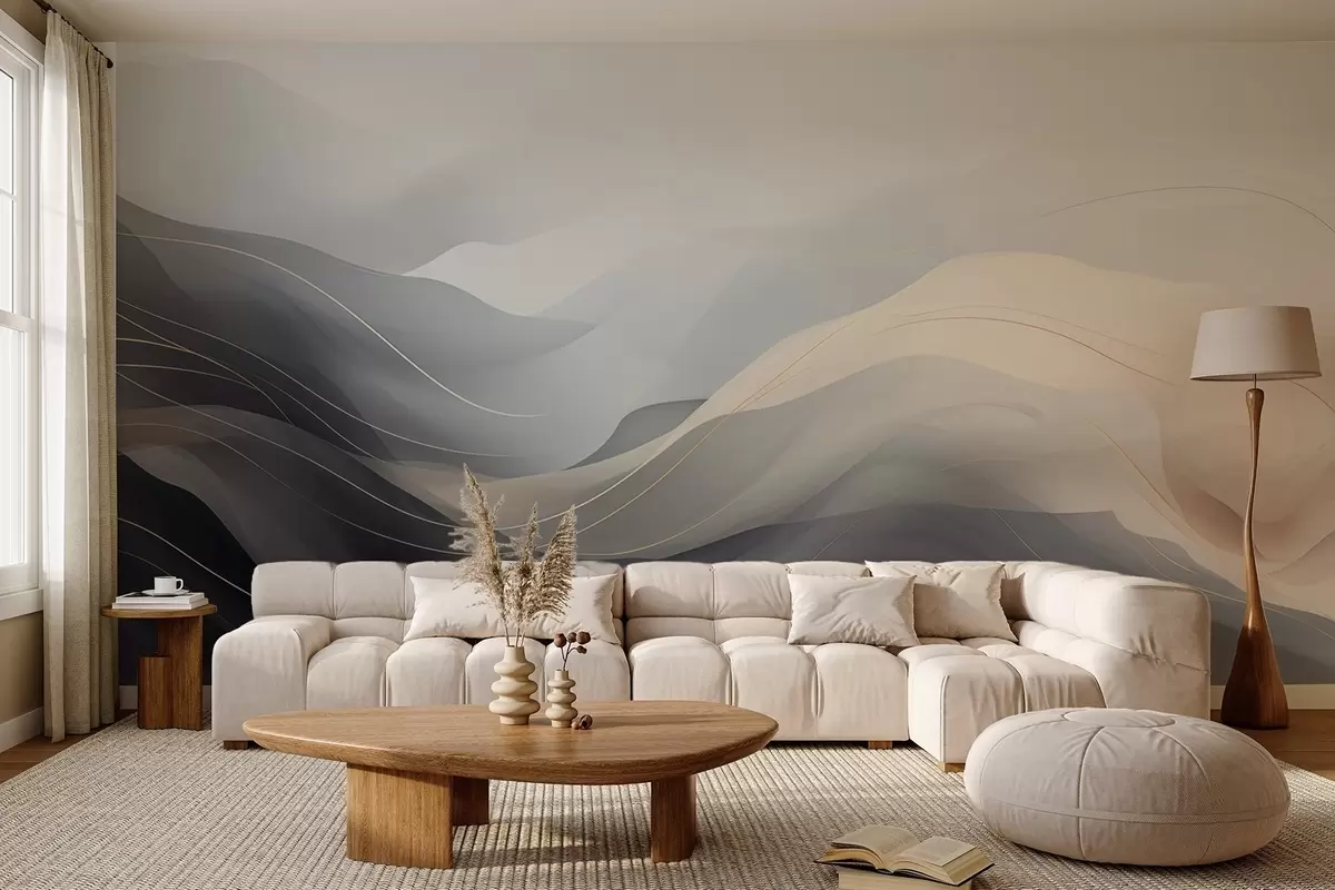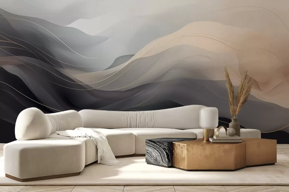carta da parati Onde astratte e nebbiose nei toni del grigio-crema con linee gialle nr. w09504