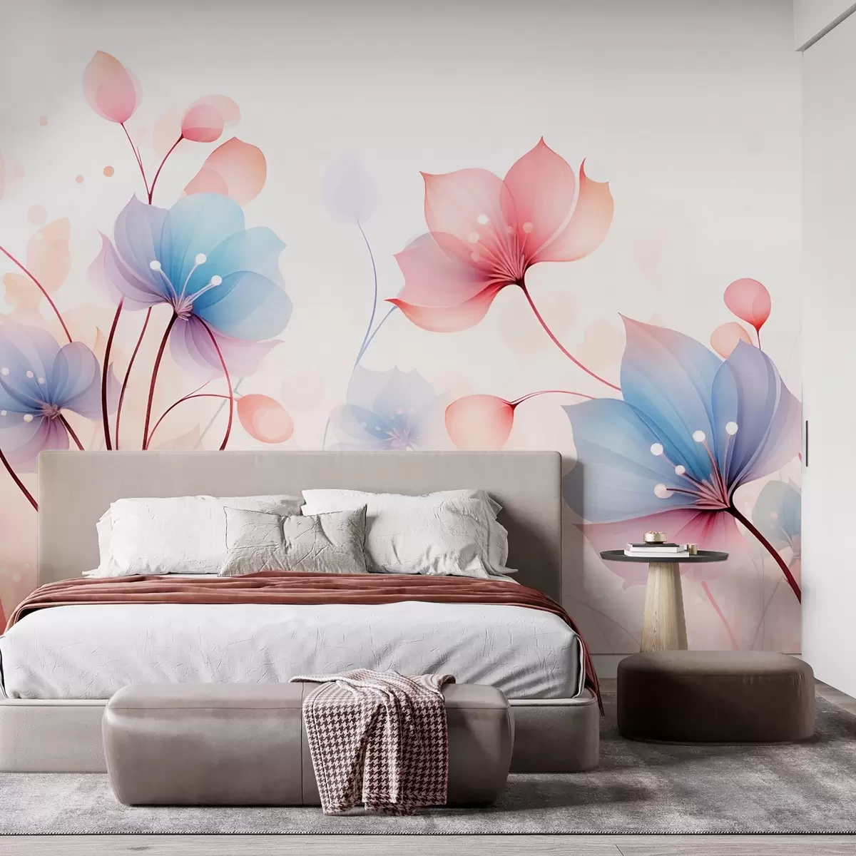 Carta da parati Delicati fiori rosa-blu — flora ariosa su sfondo bianco acquerellato nr. w09507