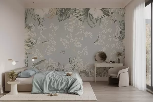 Carta da parati Arte tropicale dai colori pastello con uccelli, farfalle, fiori di ibisco, foglie di palma e alberi su sfondo azzurro. nr. w09528