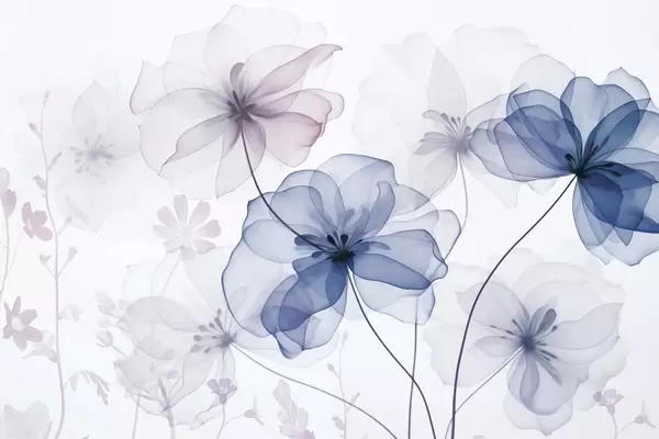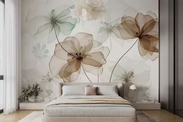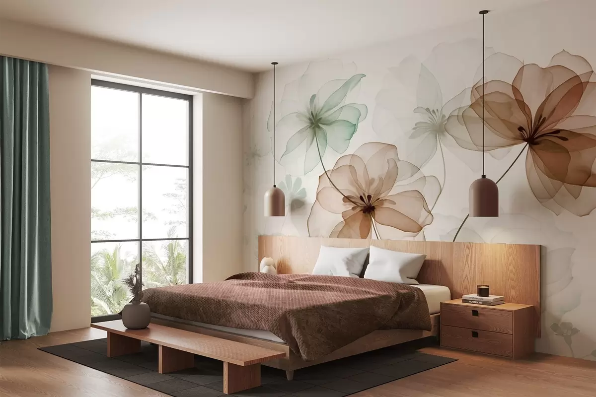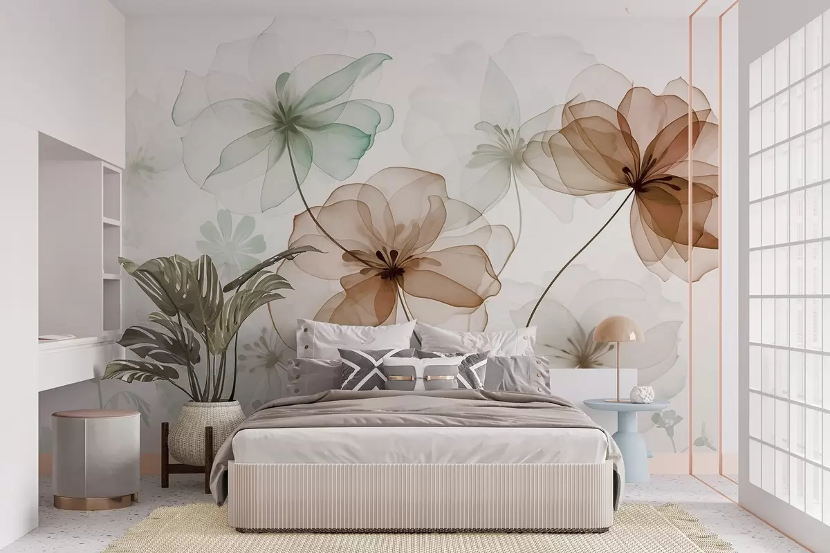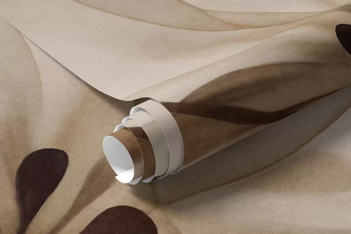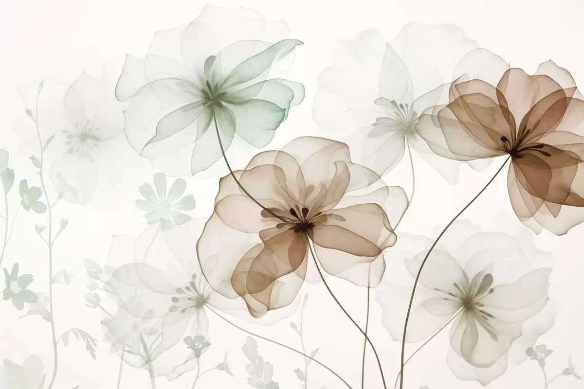 Carta da parati Fiori traslucidi con petali marroni e verdi, steli lunghi, sfondo chiaro, colori tenui, disegno floreale strutturato nr. w09529