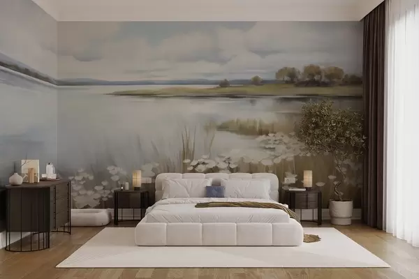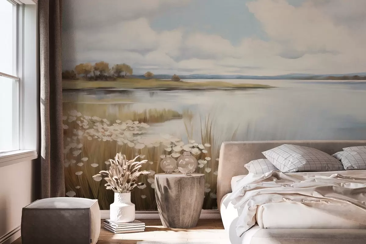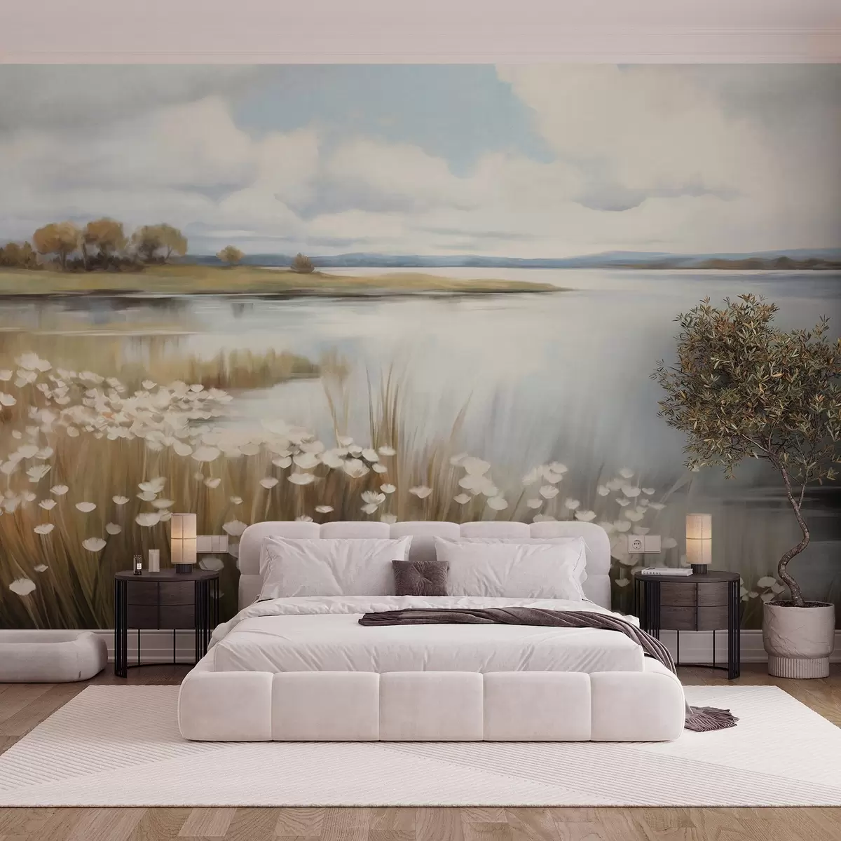 Carta da parati Paesaggio strutturato, campo di fiori bianchi ed erba alta, un lago sullo sfondo, una collina erbosa con alberi, colori tenui nr. w09530