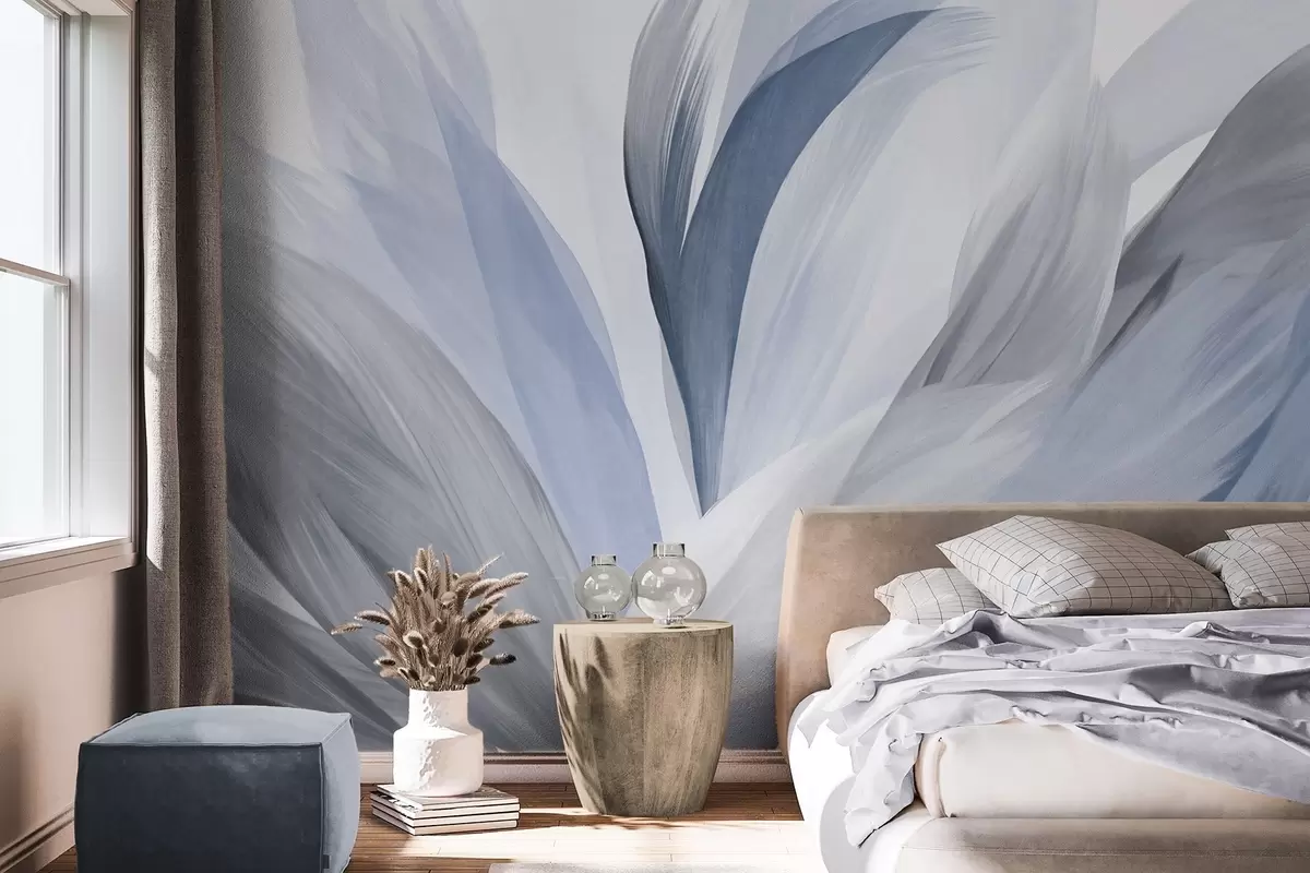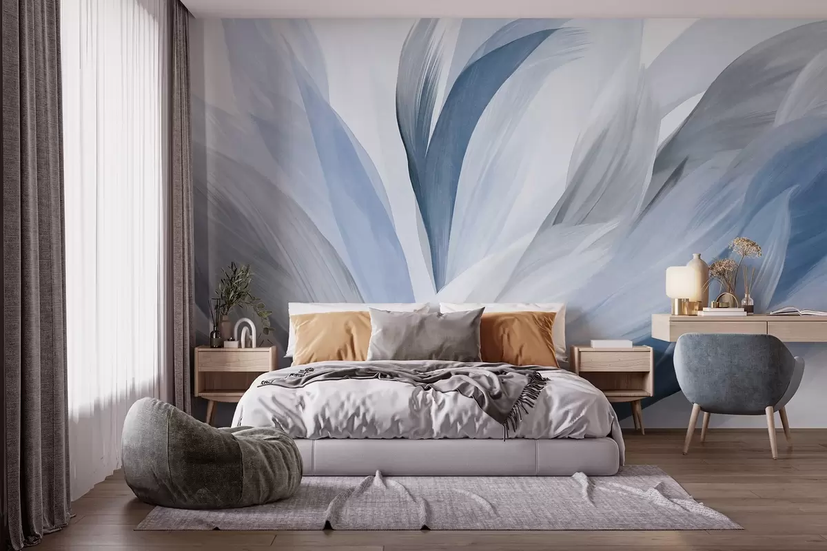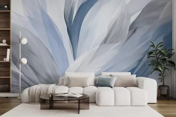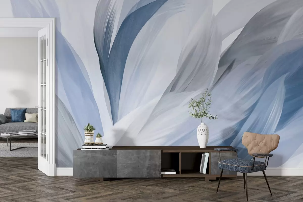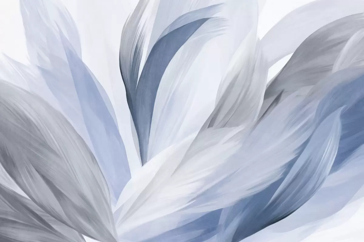 Carta da parati Piume astratte con texture in blu, bianco, grigio e varie sfumature, sovrapposte su uno sfondo bianco nr. w09531v1