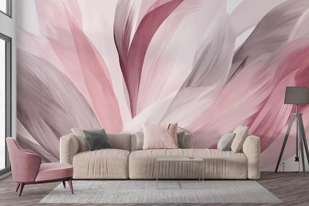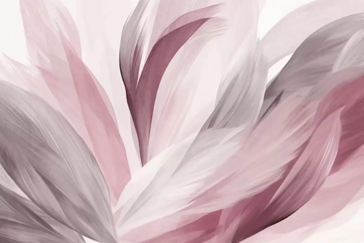 Carta da parati Piume astratte con texture in rosa, bianco, grigio e varie sfumature, sovrapposte su uno sfondo bianco nr. w09531v2
