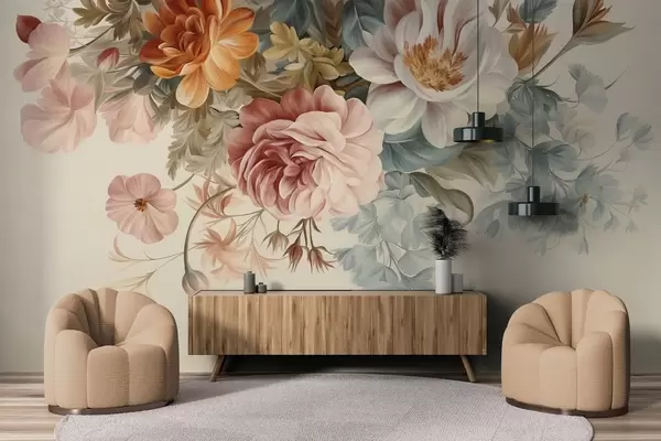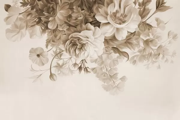 Carta da parati Composizione floreale vintage con rose, peonie e altri fiori dalla texture particolare con fogliame, su sfondo chiaro nr. w09532