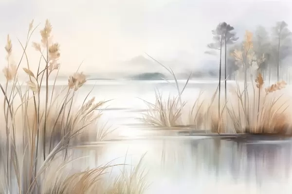 Carta da parati Paesaggio con un lago e erba alta in primo piano, montagne sullo sfondo, colori tenui, texture nr. w09534