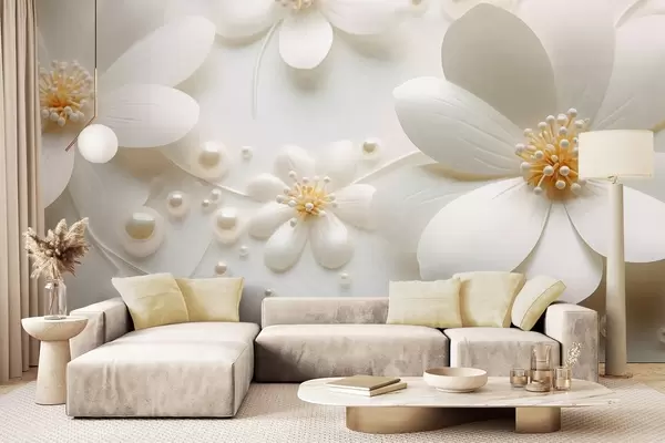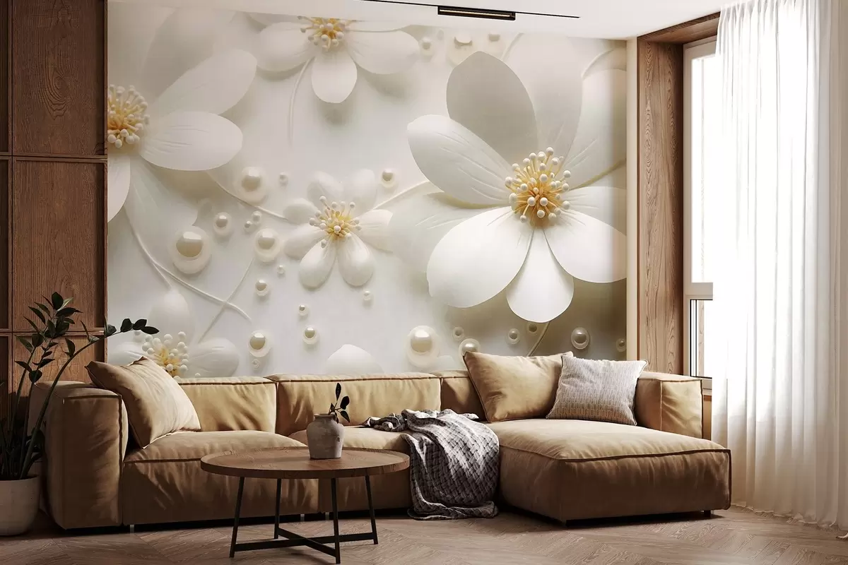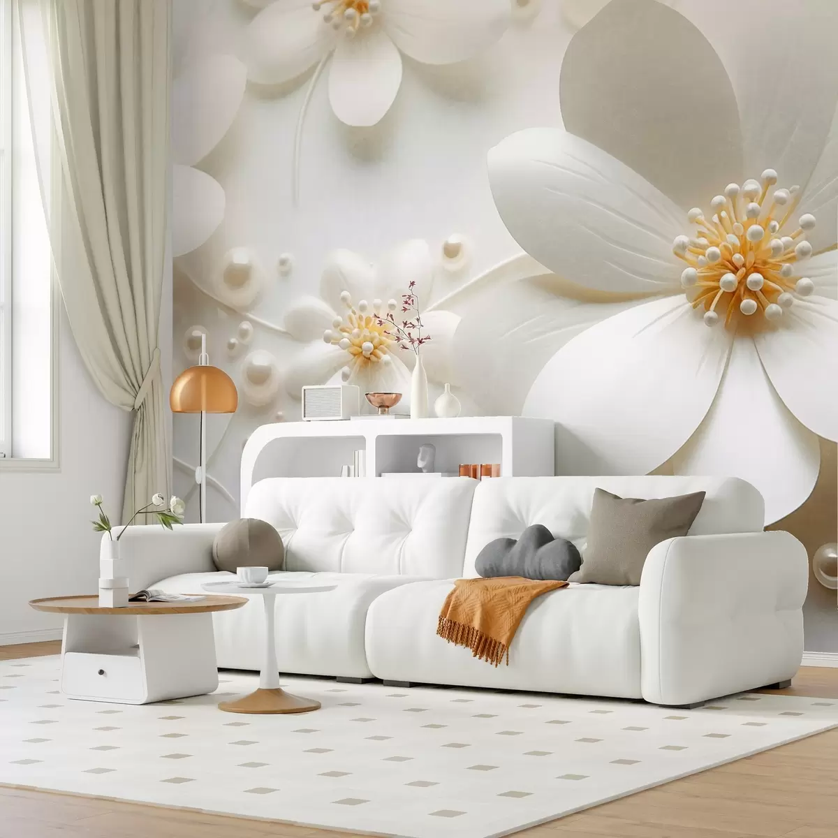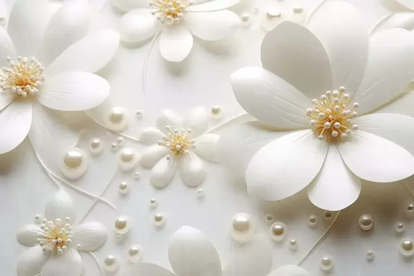 Carta da parati Fiori bianchi con perle sparse su sfondo bianco, design elegante e minimalista, texture nr. w09535