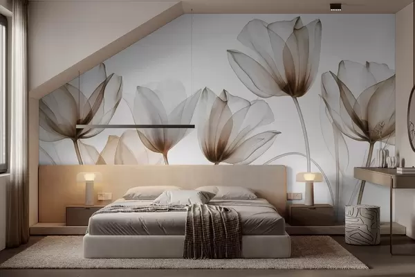 Carta da parati Fiori di tulipano traslucidi marroni e bianchi con steli lunghi, su sfondo chiaro, arte floreale delicata e ricca di texture nr. w09538v1