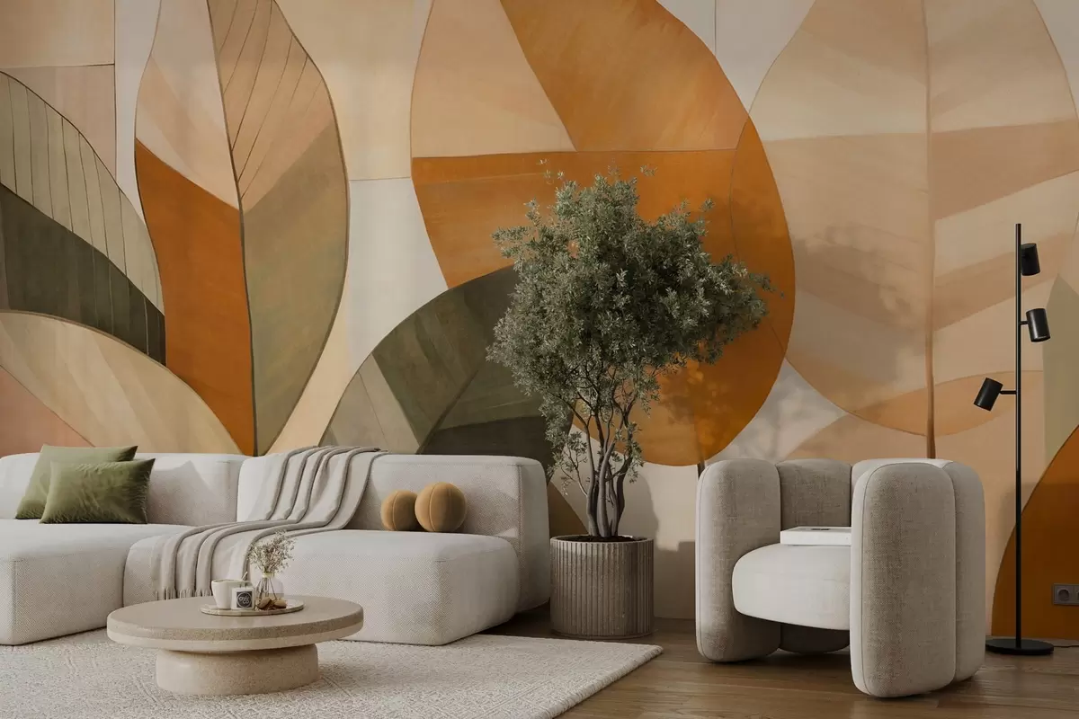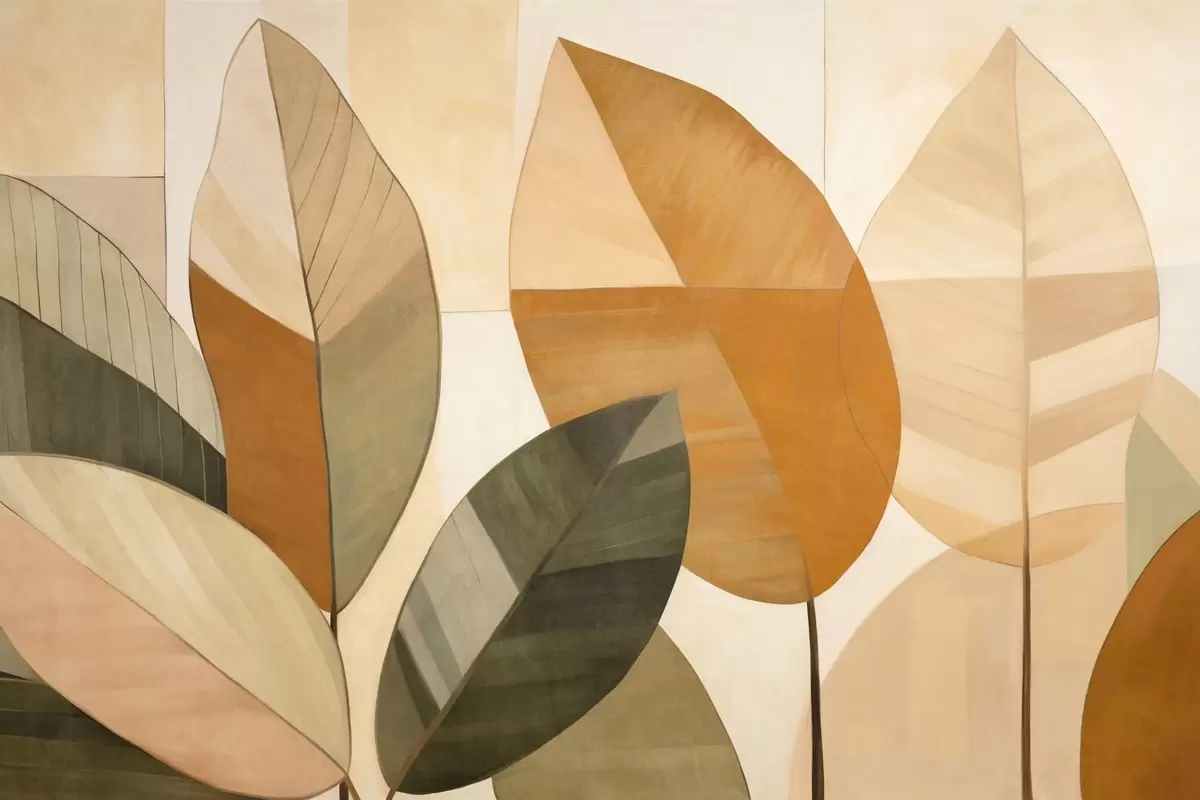 Carta da parati Foglie astratte di grandi dimensioni nei toni dell'arancione, del marrone e del verde, con texture, disposte su uno sfondo chiaro. nr. w09539