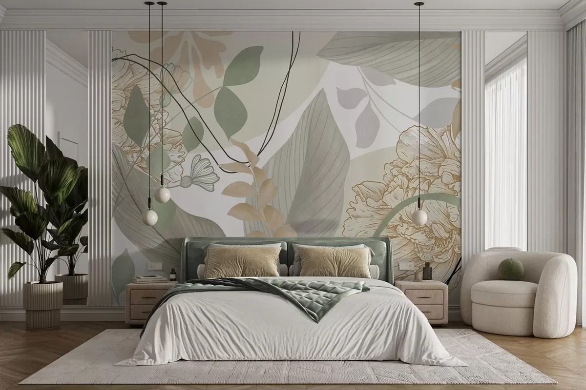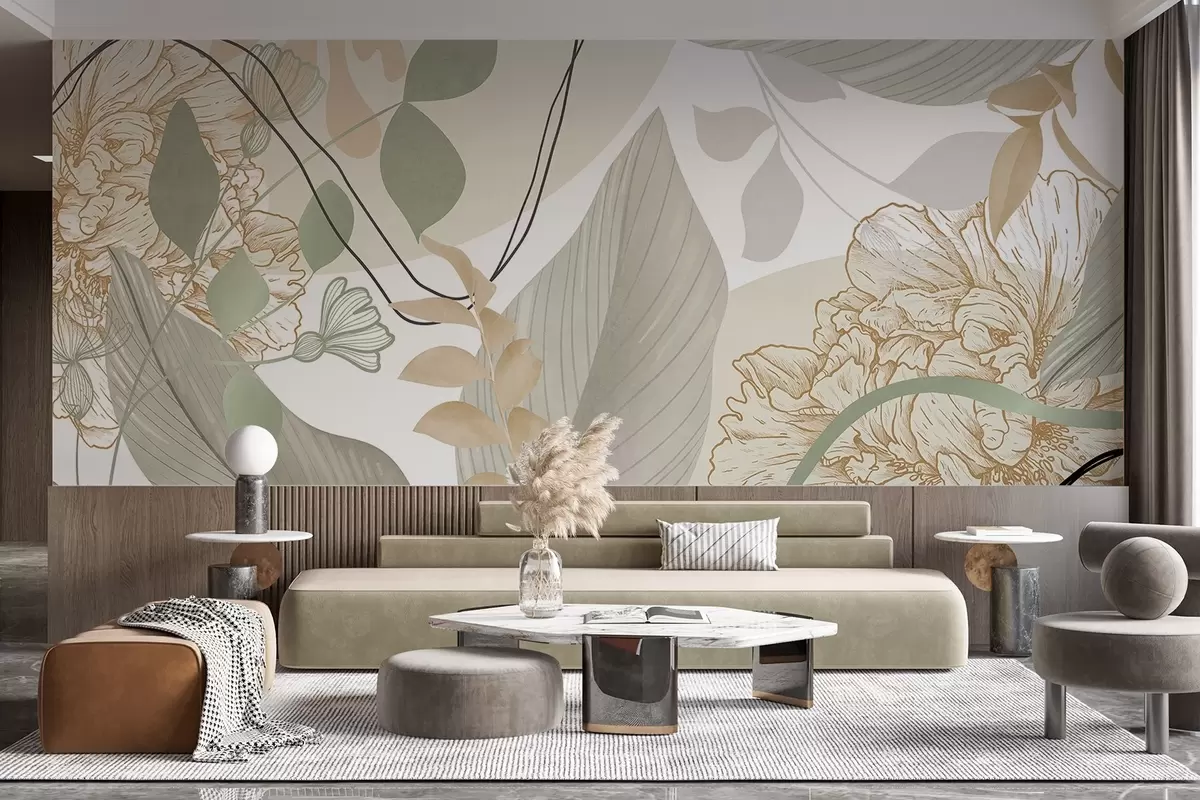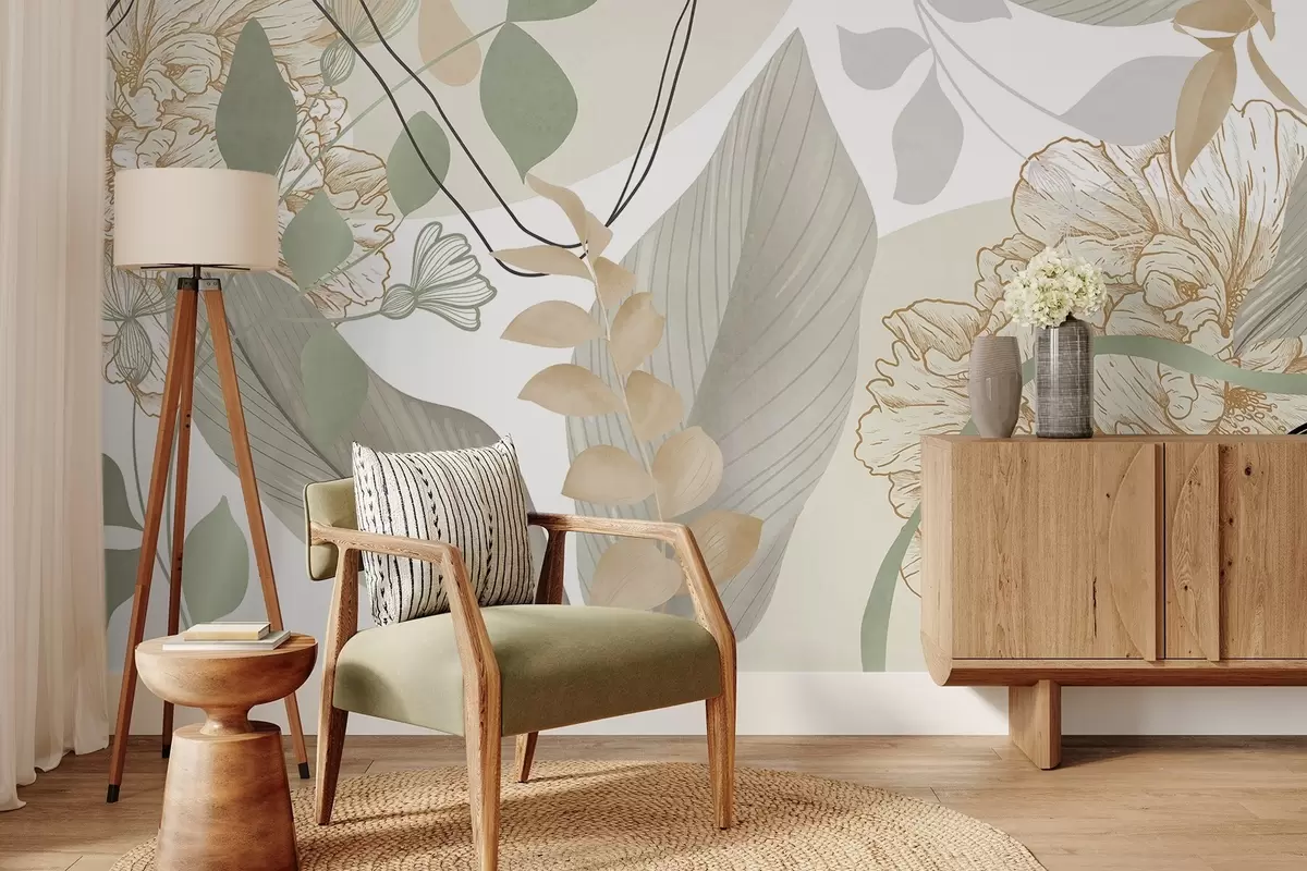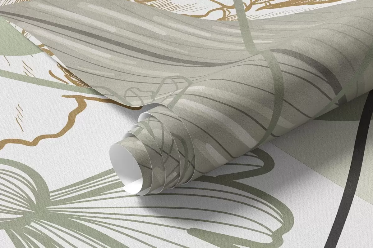 Carta da parati Stampa floreale astratta con grandi foglie nei toni del verde tenue e del giallo con sottili linee nere e contorni floreali bianchi nr. w09544v2