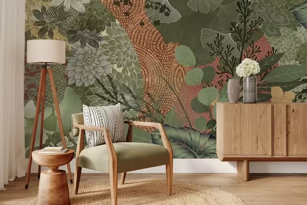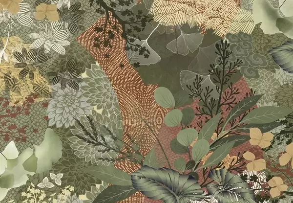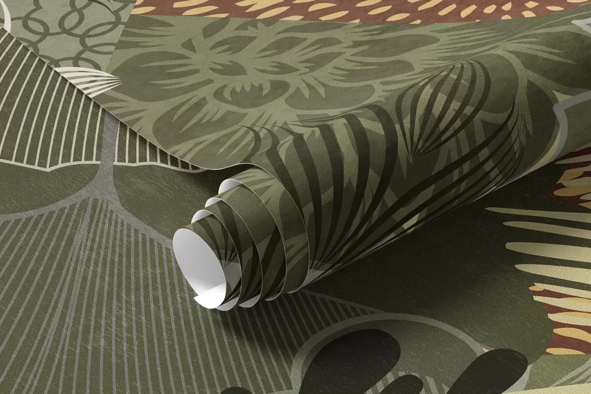 Carta da parati Collage astratto con elementi botanici, foglie, fiori e texture organiche, nei toni del verde e del marrone. nr. w09545