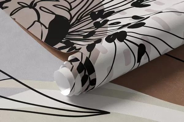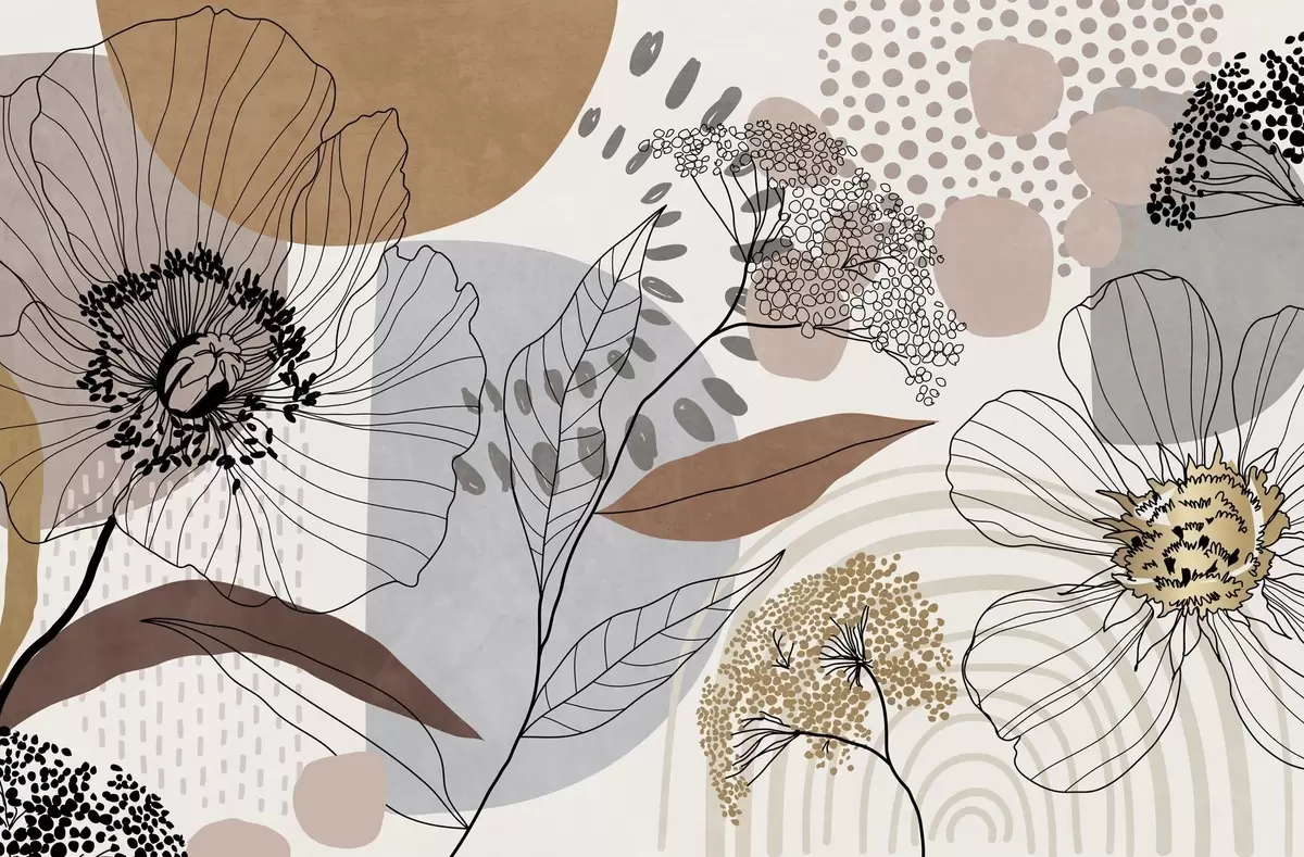 Carta da parati Stampa floreale astratta con fiori, foglie e forme organiche in toni tenui di marrone, beige e grigio. nr. w09548