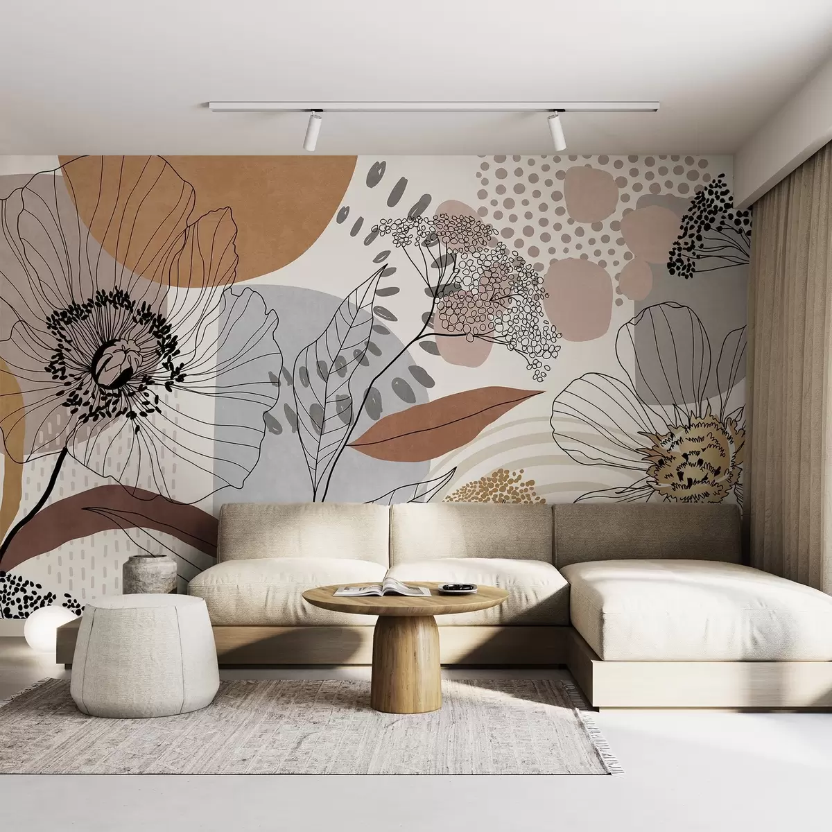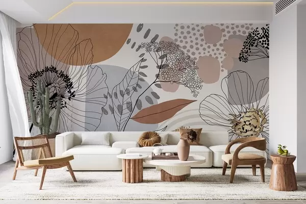 Carta da parati Stampa floreale astratta con fiori, foglie e forme organiche in toni tenui di marrone, beige e grigio nr. w09548