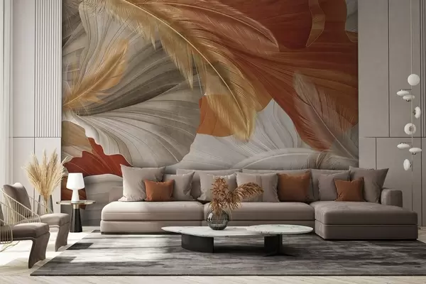 Carta da parati Forme fluide astratte e strutturate nei colori crema e ruggine con delicate piume gialle, beige e marroni nr. w09549