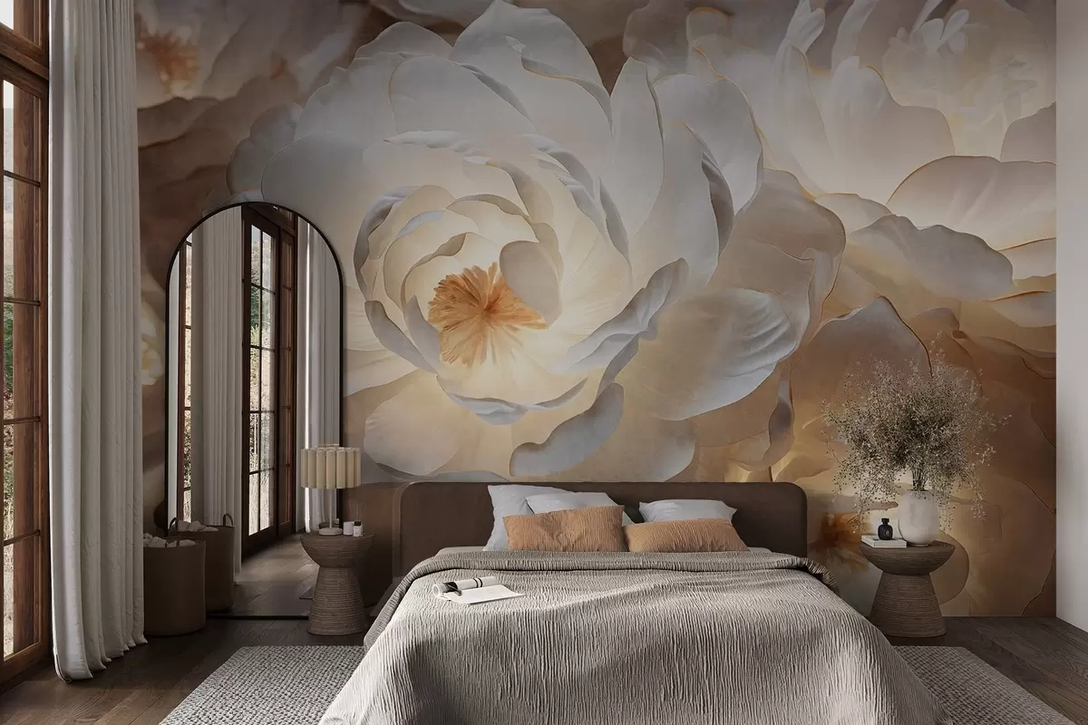 carta da parati Grandi fiori di peonia bianchi con centro giallo, illuminazione soffusa e petali delicati e stratificati. nr. w09550