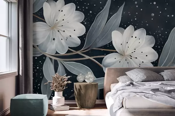Carta da parati Fantastici fiori bianchi dalla texture particolare, circondati da foglie e rami blu-verdi su uno sfondo scuro. nr. w09551