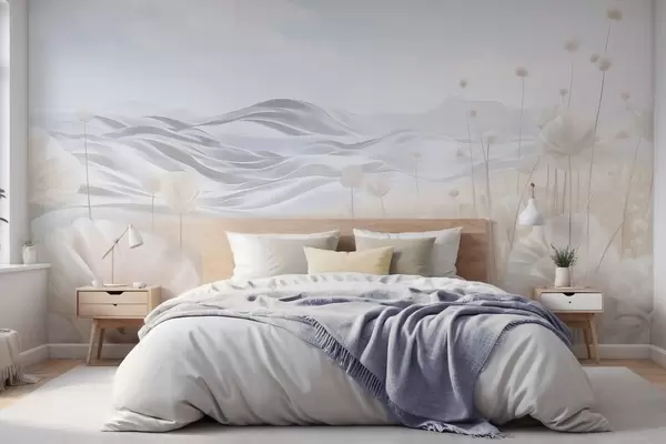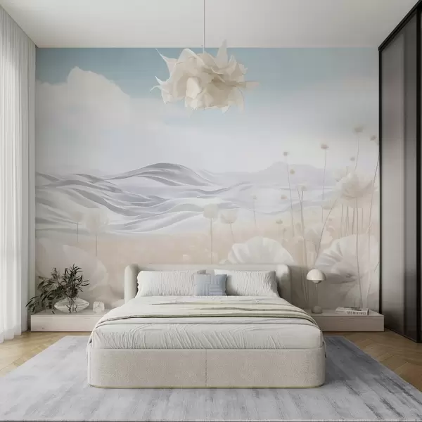 Carta da parati Campo di papaveri color crema con dolci colline sotto un cielo azzurro pallido con nuvole soffici, colori pastello nr. w09553