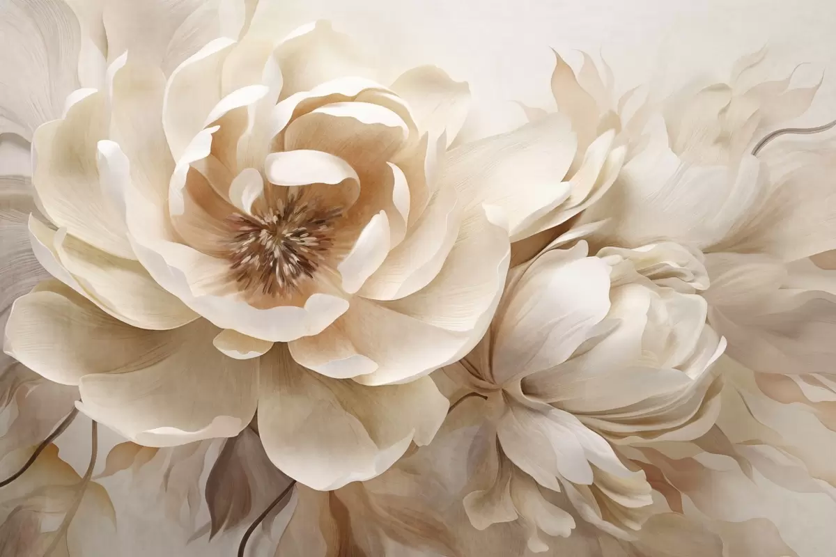 Carta da parati Peonie dalla consistenza cremosa con centro marrone e foglie su uno sfondo astratto sfocato e chiaro nr. w09554