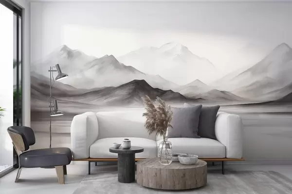 Carta da parati Un paesaggio monocromatico e strutturato con montagne nebbiose e un lago in primo piano nr. w09555