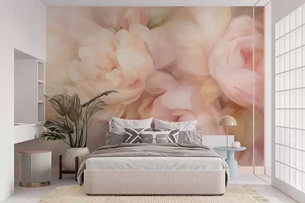 Carta da parati Peonie sfocate color rosa pallido e crema con morbide pennellate pittoriche, che creano una composizione floreale ricca di texture. nr. w09556