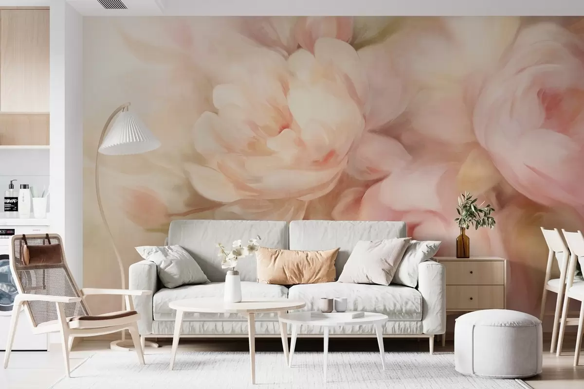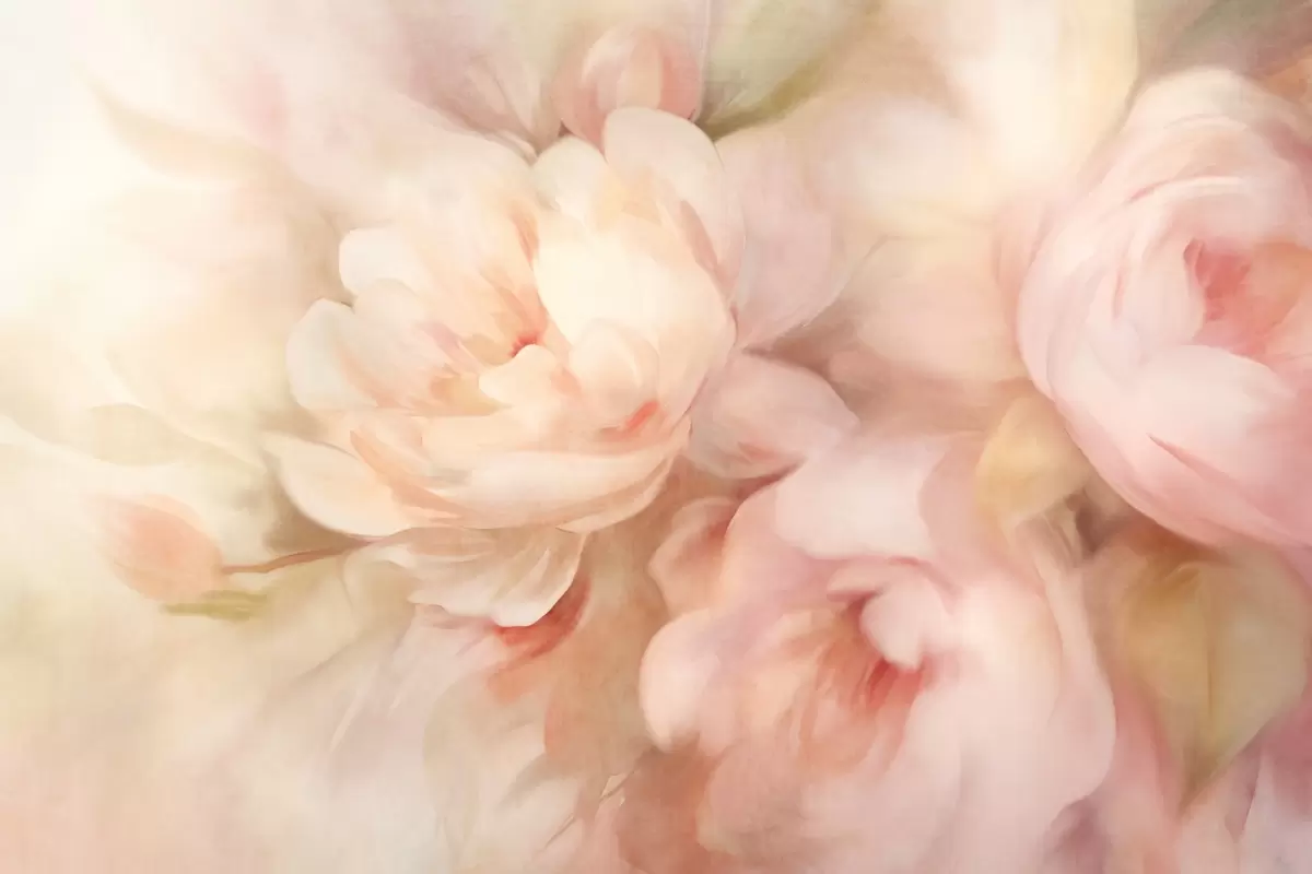 Carta da parati Peonie sfocate color rosa pallido e crema con morbide pennellate pittoriche, che creano una composizione floreale ricca di texture. nr. w09556