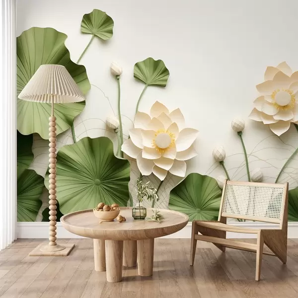 Carta da parati Fiori di loto in 3D con foglie verdi testurizzate, stile minimalista nr. w09560