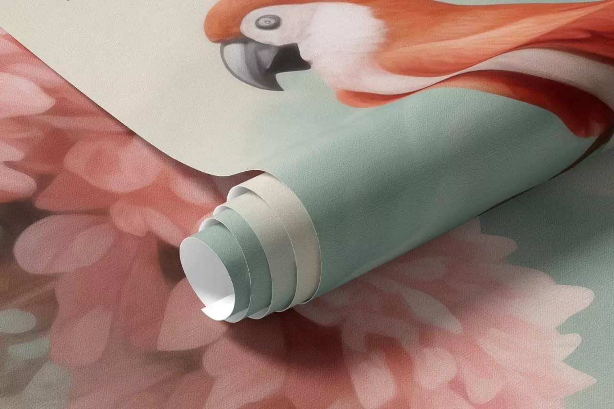 Carta da parati Una foresta tropicale da favola con pappagalli, alberi in fiore con boccioli rosa e una cascata. nr. w09580