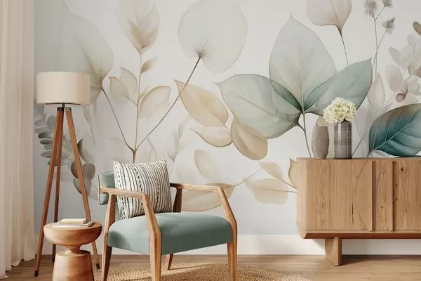 Carta da parati Foglie traslucide e ruvide in tonalità tenui di beige e verde acqua, con steli delicati su uno sfondo morbido e chiaro nr. w09583
