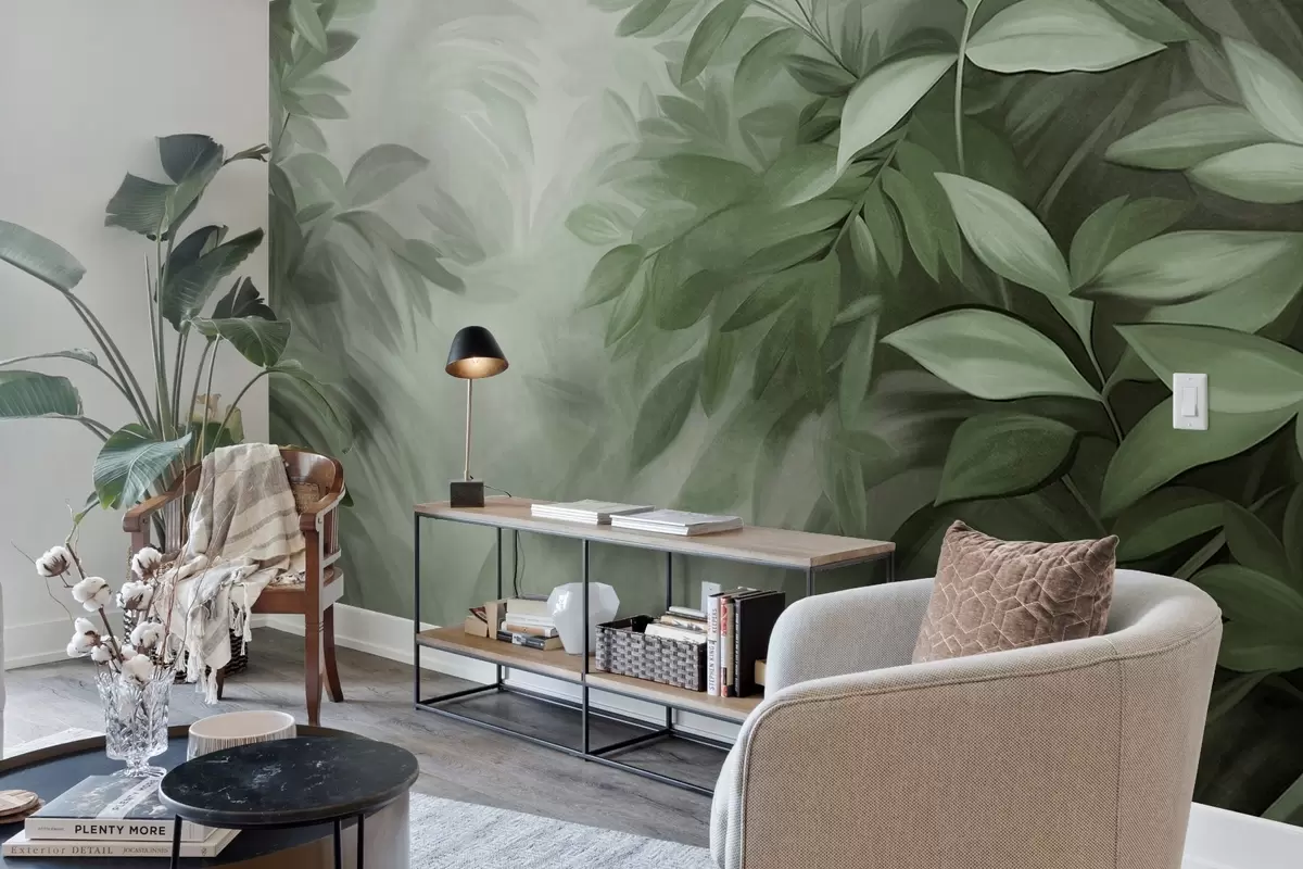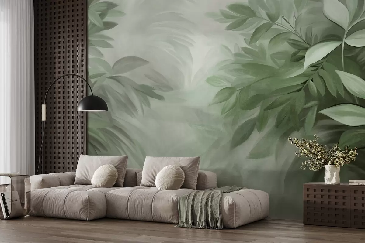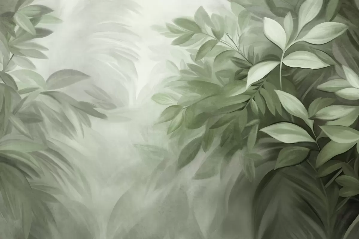 Carta da parati Foglie verdi e grigie con fogliame morbido e sfumato, in uno stile pittorico con pennellate visibili. nr. w09584v1