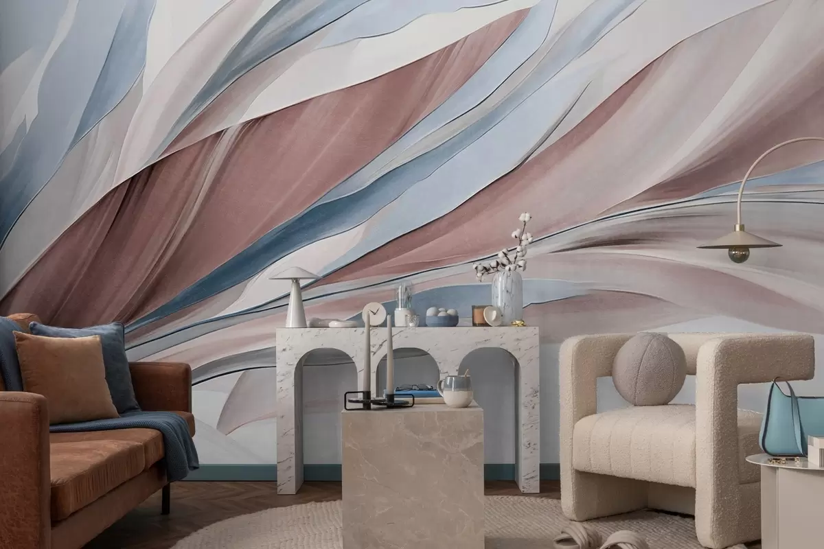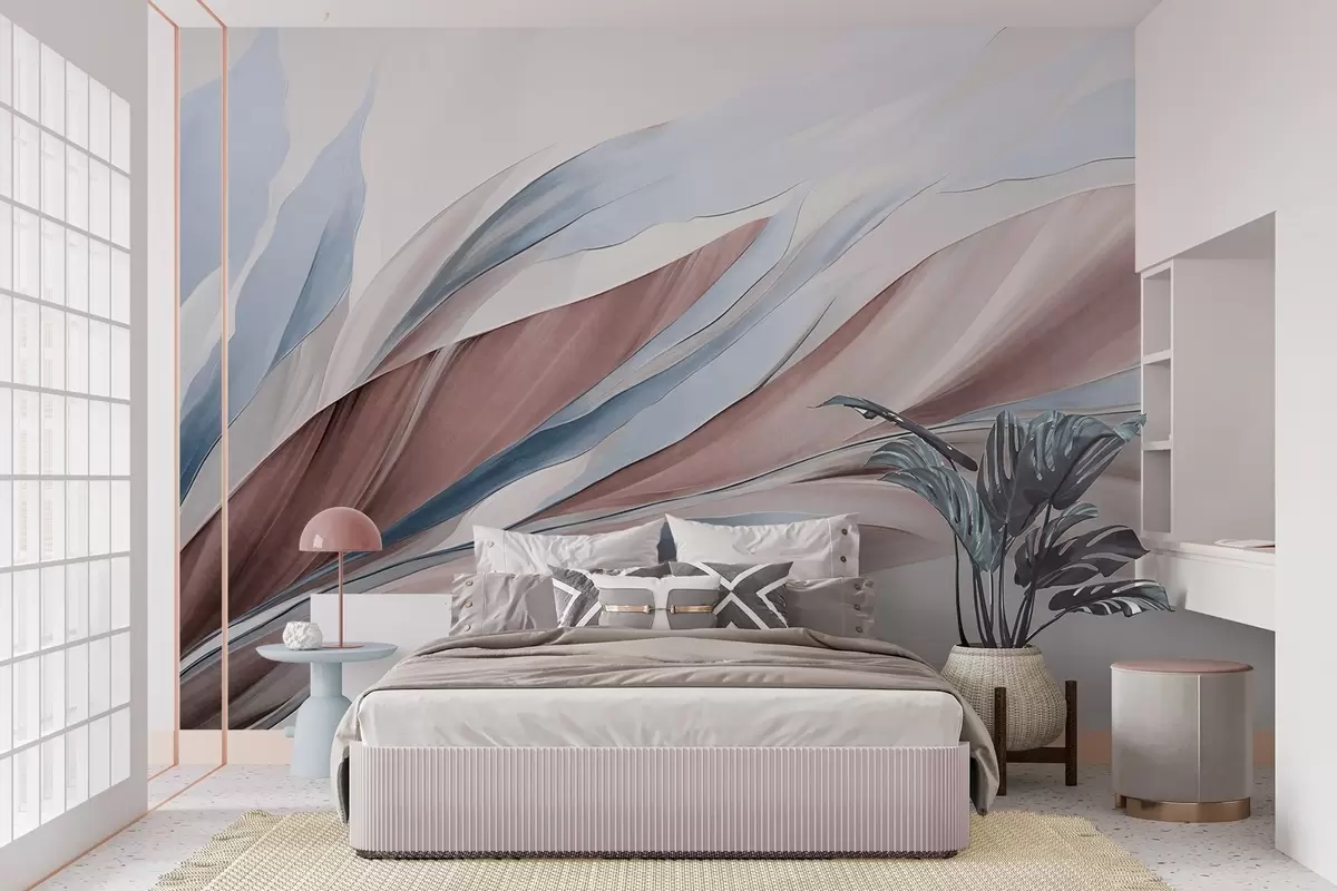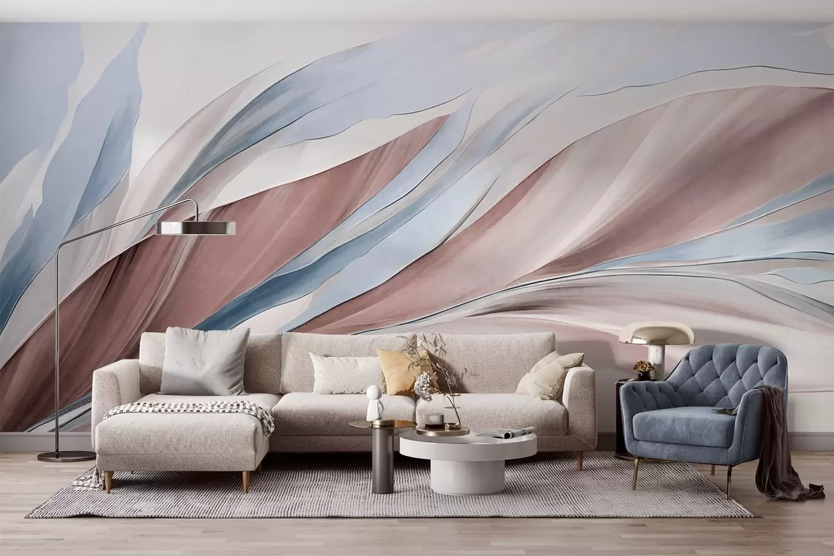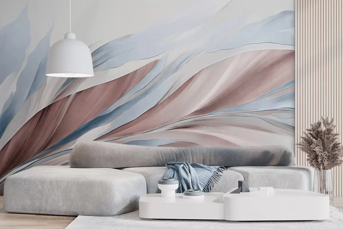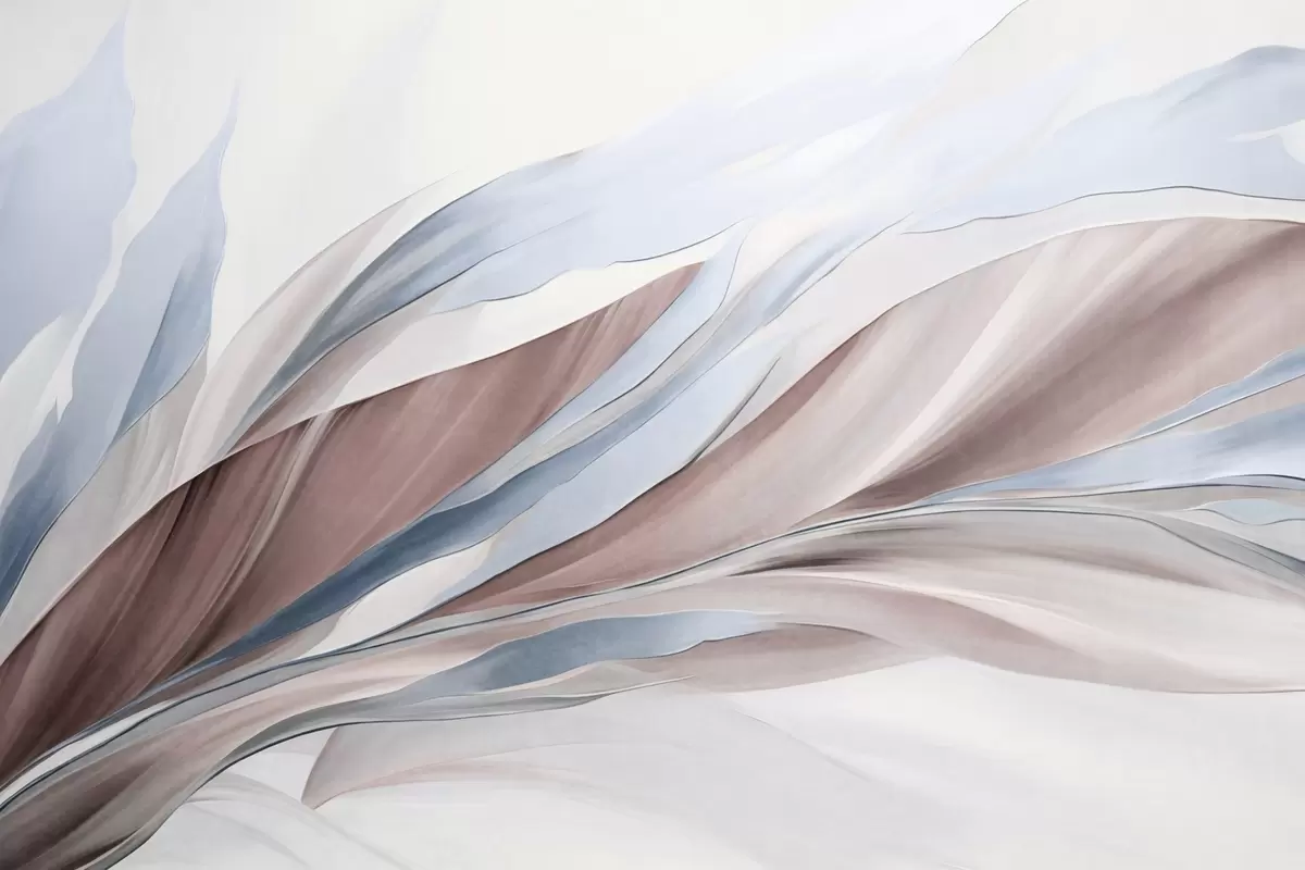 Carta da parati Astratto: onde fluide blu e marroni, con forme e linee sottili, su sfondo bianco, arte materica nr. w09585v1