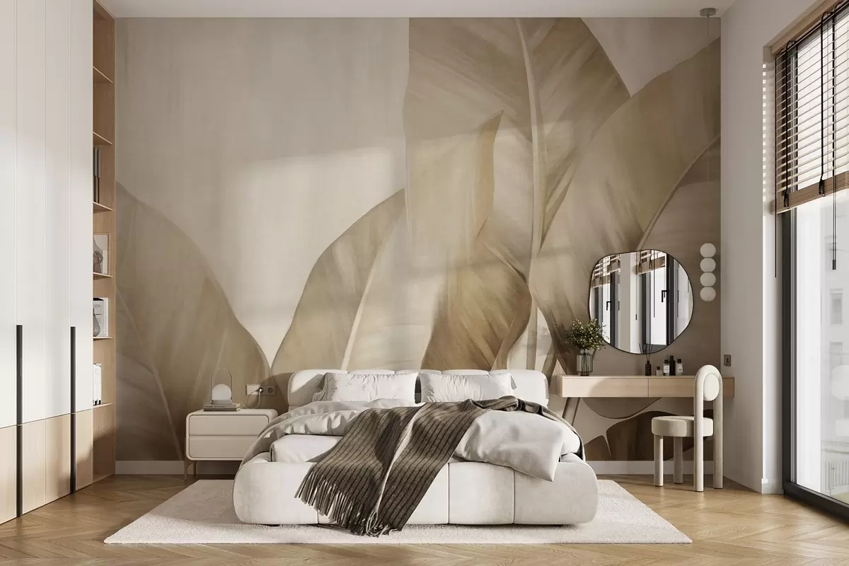 Carta da parati Grandi foglie di banano marrone chiaro con texture su sfondo beige chiaro, dall'estetica morbida e minimalista. nr. w09586
