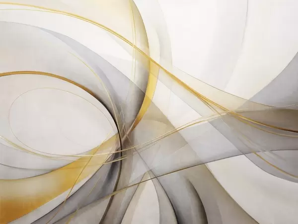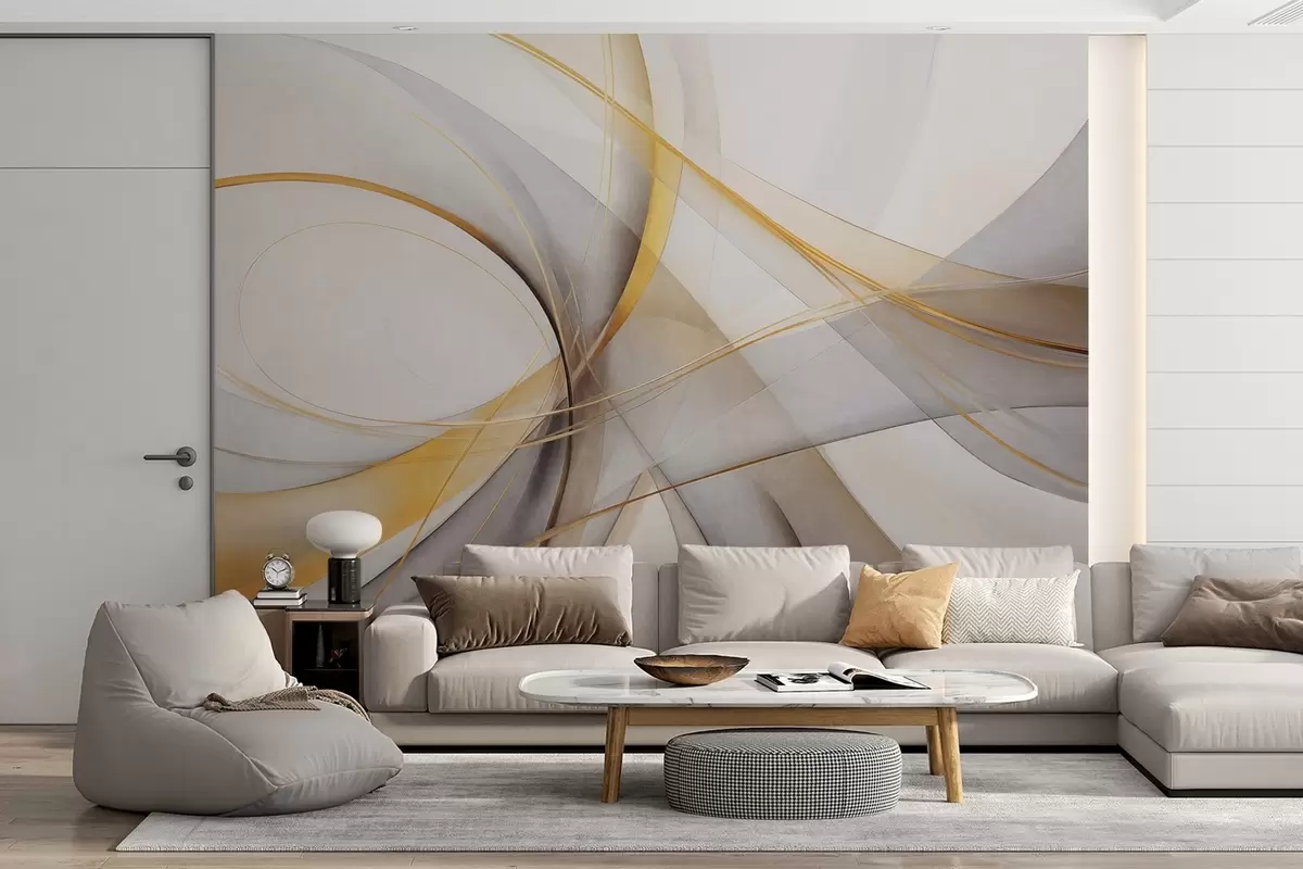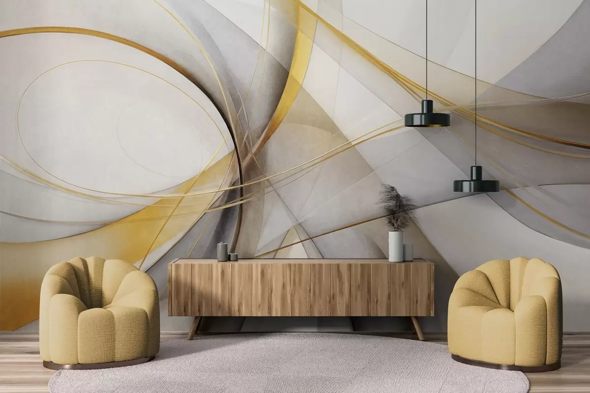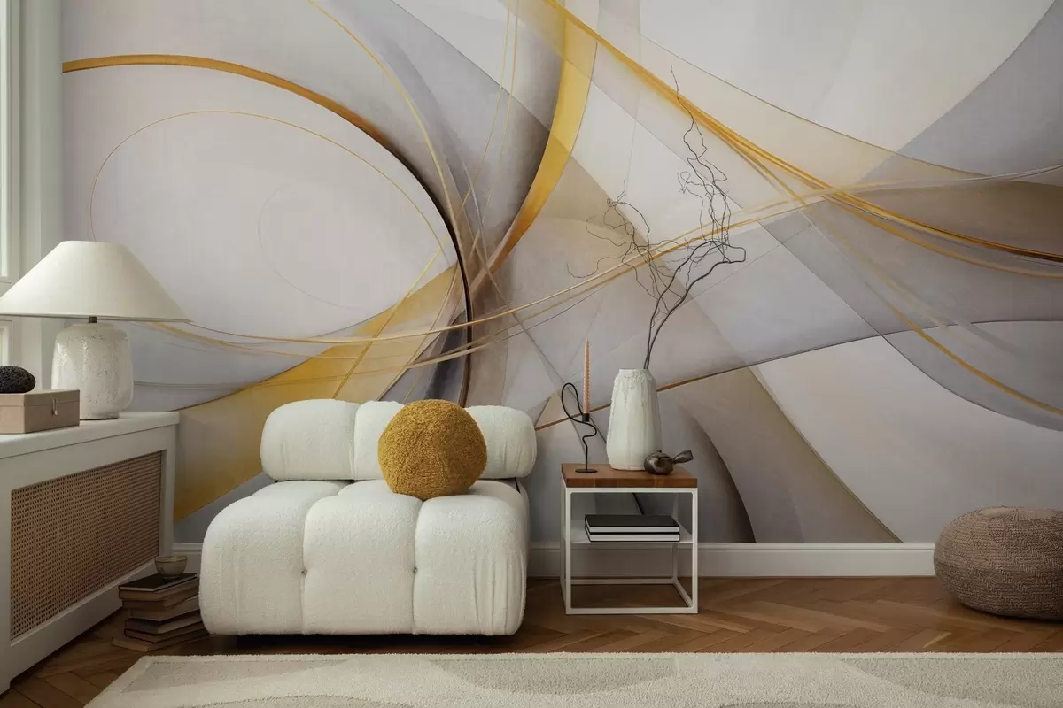 carta da parati Linee astratte fluide in giallo e bianco su sfondo grigio, con un senso di movimento e profondità, arte moderna nr. w09587