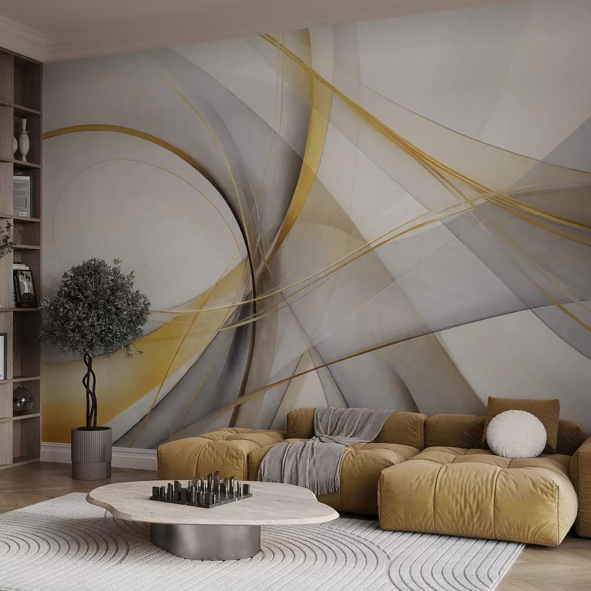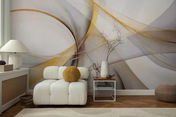 Carta da parati Linee astratte fluide in giallo e bianco su sfondo grigio, con un senso di movimento e profondità, arte moderna nr. w09587