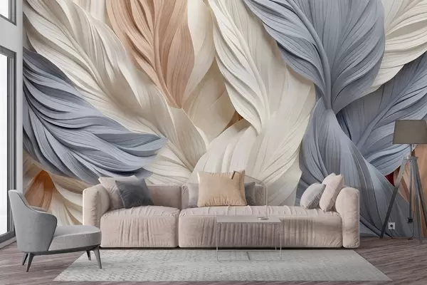 Carta da parati Piume astratte e stratificate nei toni del crema, beige e azzurro, dall'aspetto organico e materico. nr. w09603