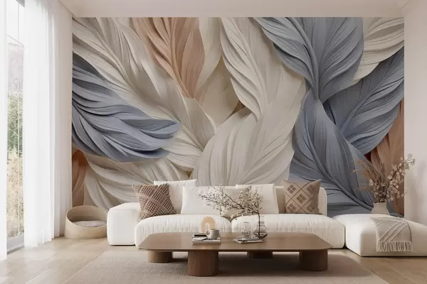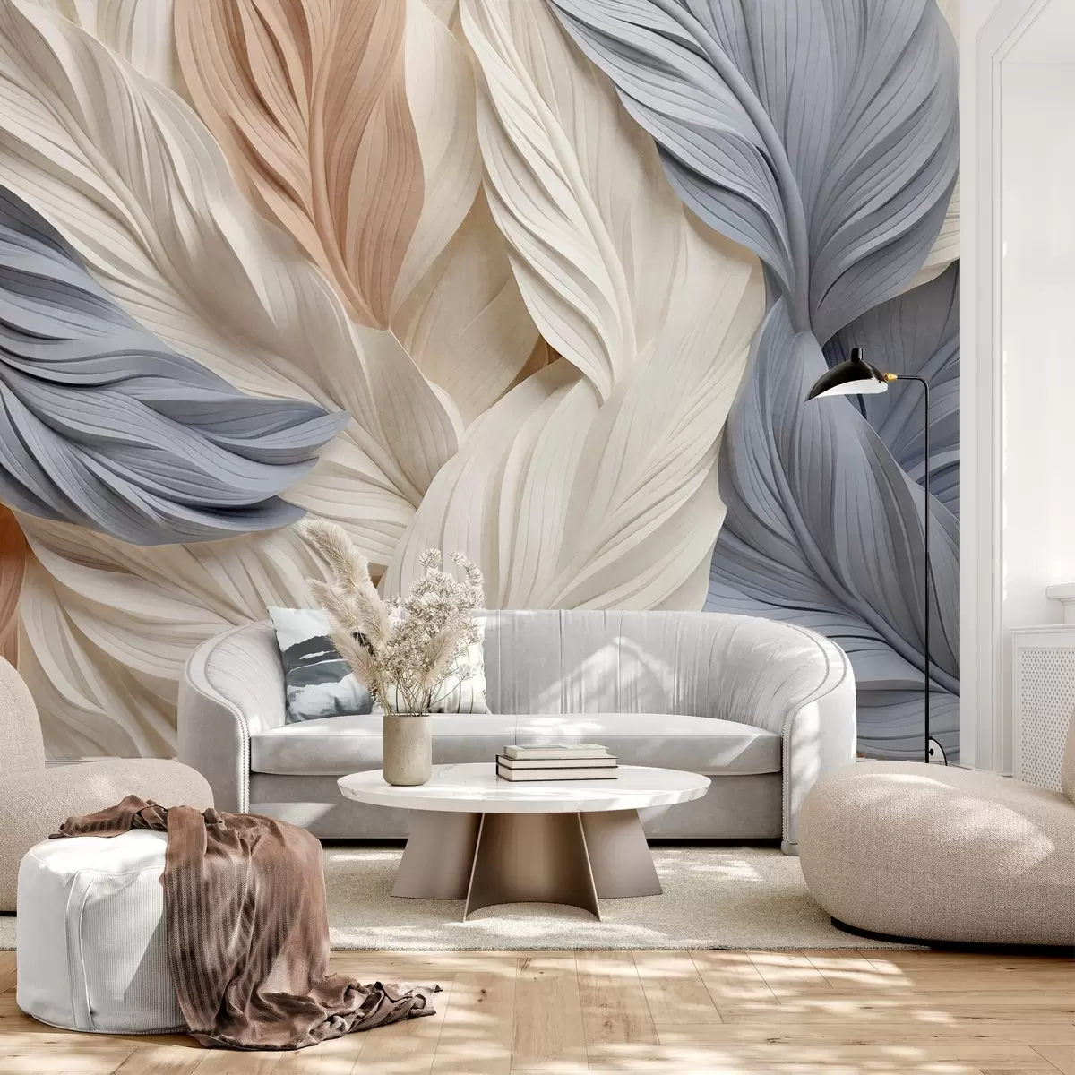 Carta da parati Piume astratte e stratificate nei toni del crema, beige e azzurro, dall'aspetto organico e materico. nr. w09603