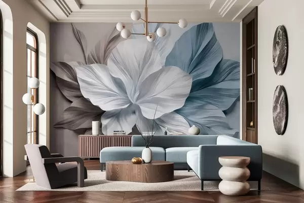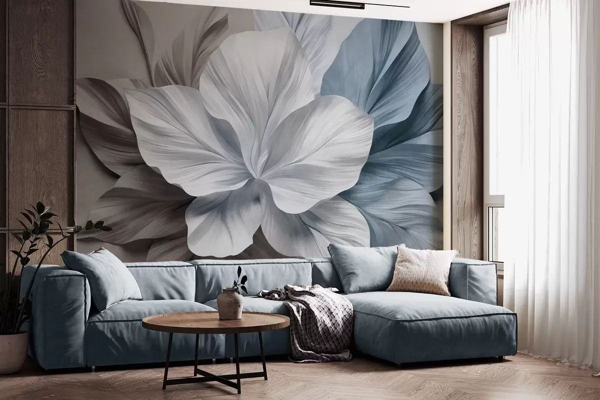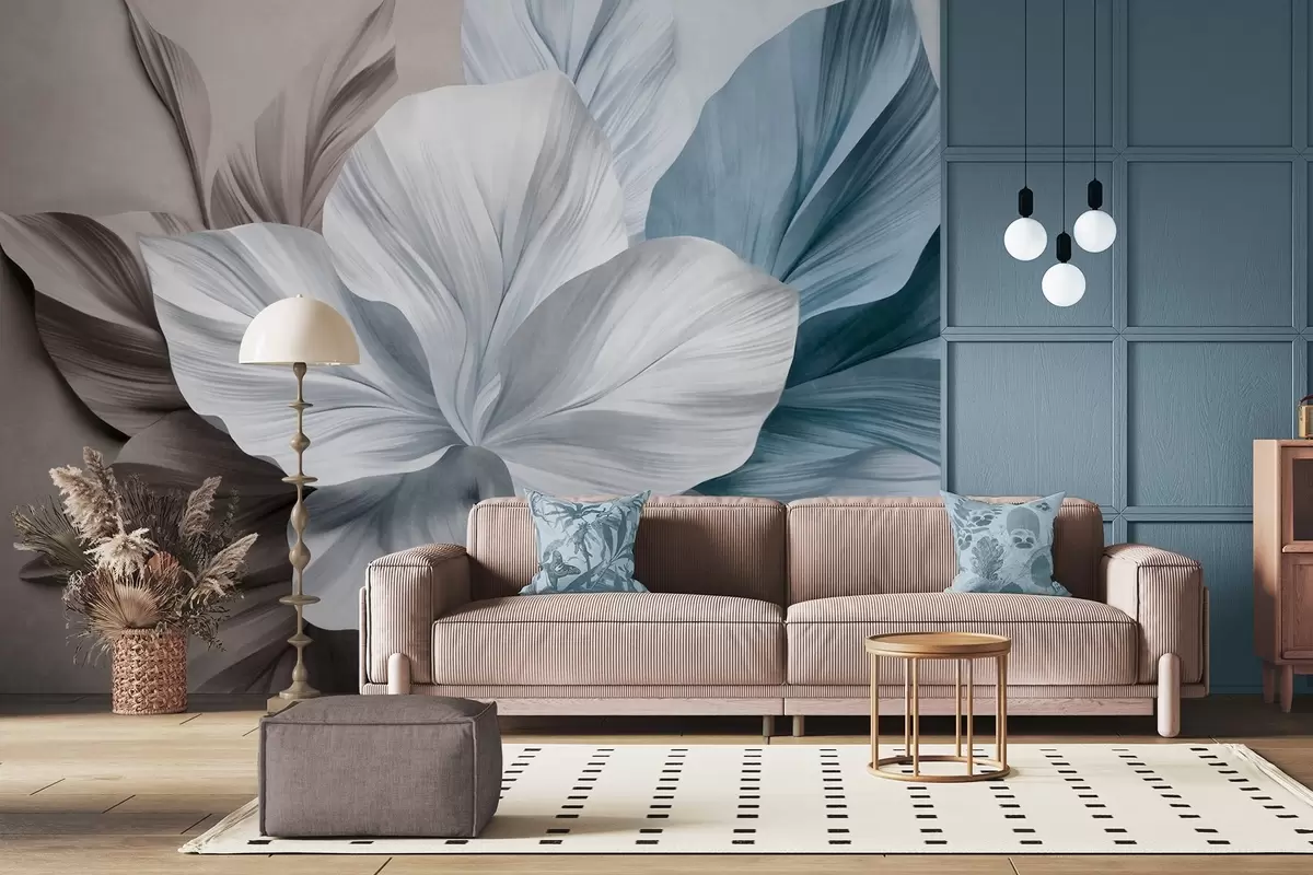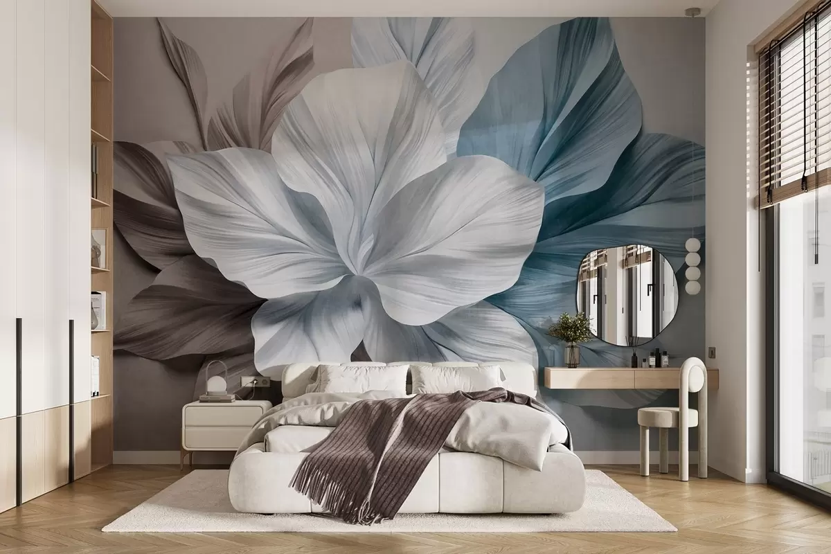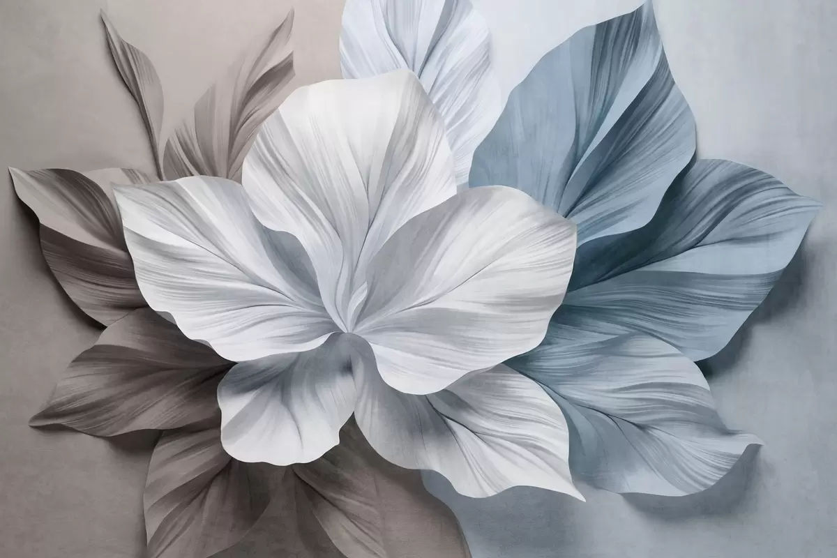 Carta da parati Fiore astratto a più petali con foglie strutturate nei toni del marrone e del blu, sfondo morbido nr. w09604v1