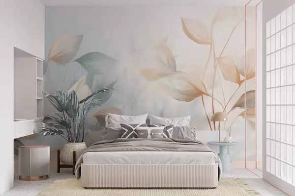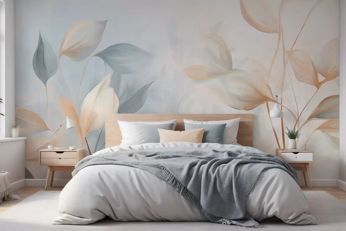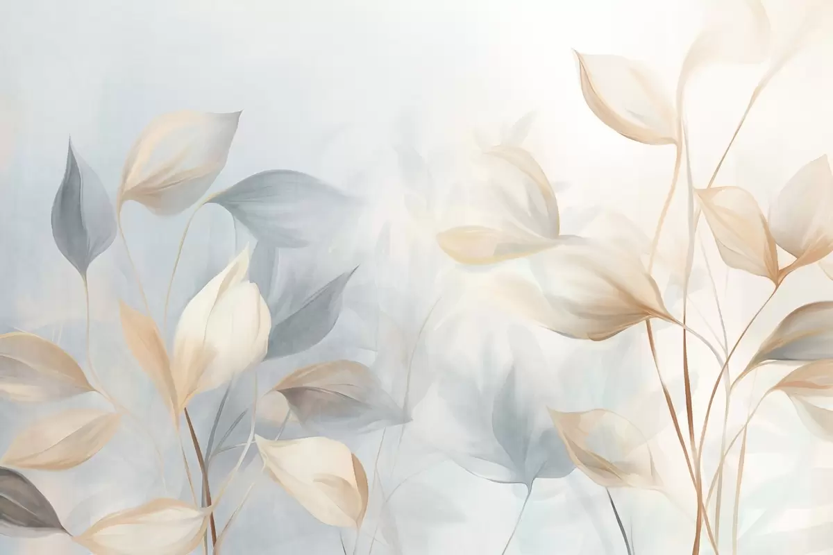 Carta da parati Foglie morbide, delicate e traslucide nei toni tenui del beige, pesca e azzurro pallido, arte pastello materica. nr. w09607