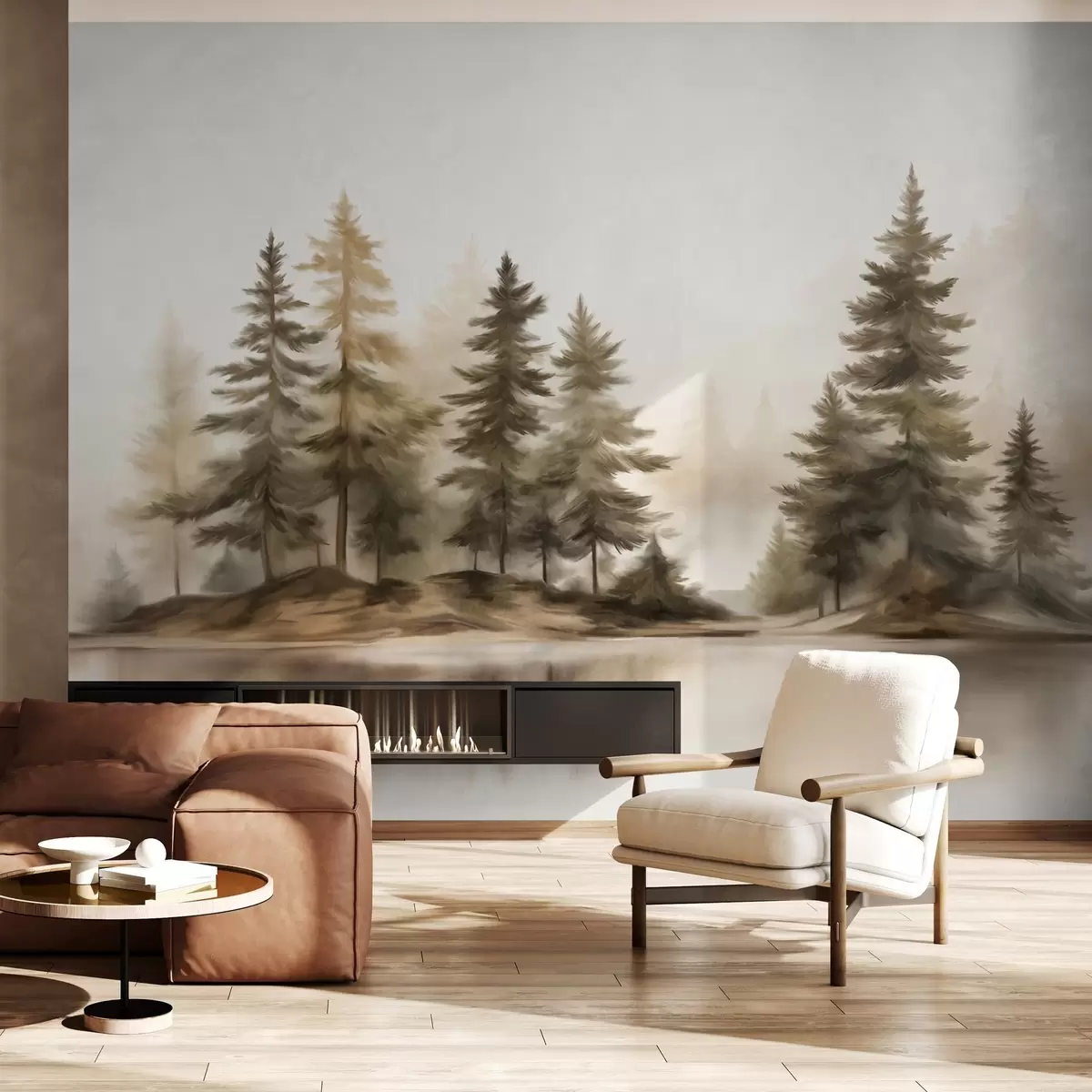 Carta da parati Una foresta nebbiosa e ricca di texture con alti pini dipinti in modo realistico nr. w09610