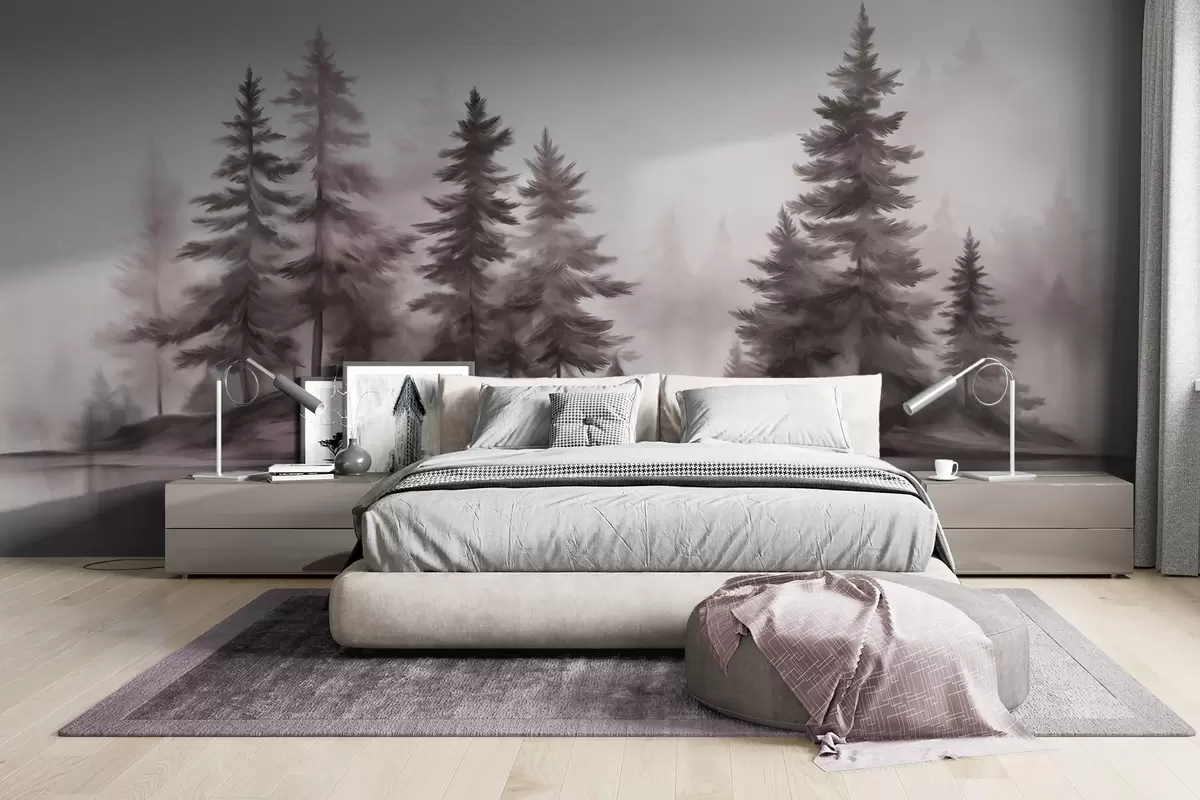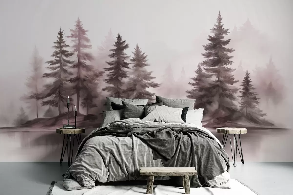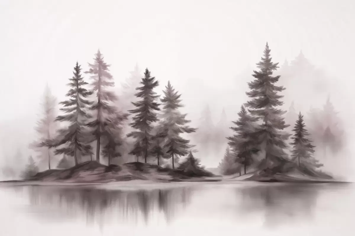 Carta da parati Una foresta nebbiosa e ricca di texture con alti pini dipinti in modo realistico nr. w09610v1