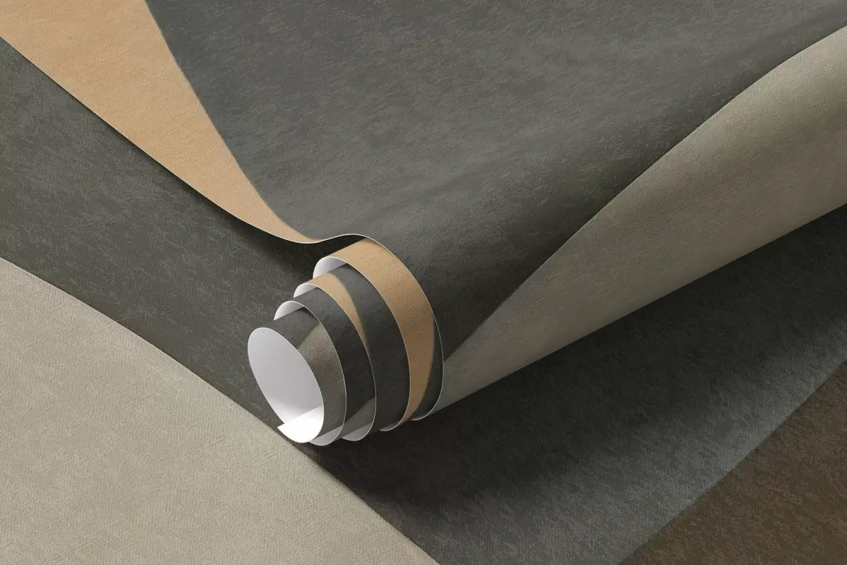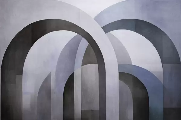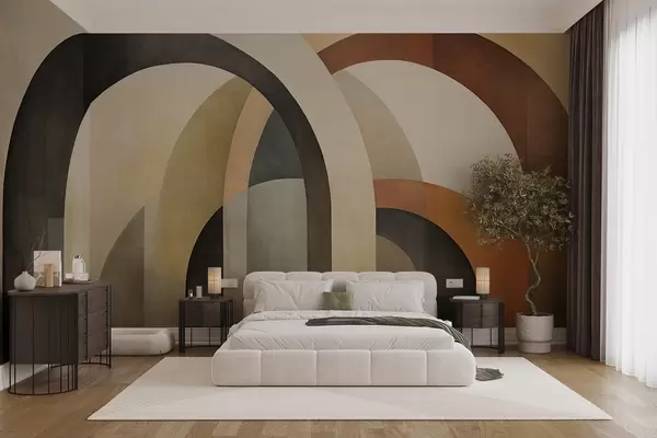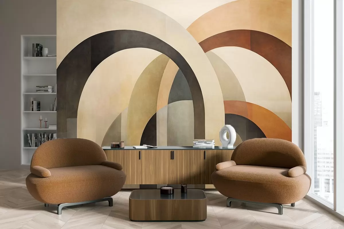 Carta da parati Archi geometrici astratti con texture in tonalità terrose di beige, marrone e grigio, un design architettonico moderno e stratificato. nr. w09611