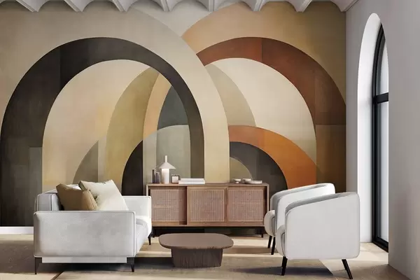 Carta da parati Archi geometrici astratti con texture in tonalità terrose di beige, marrone e grigio, un design architettonico moderno e stratificato. nr. w09611