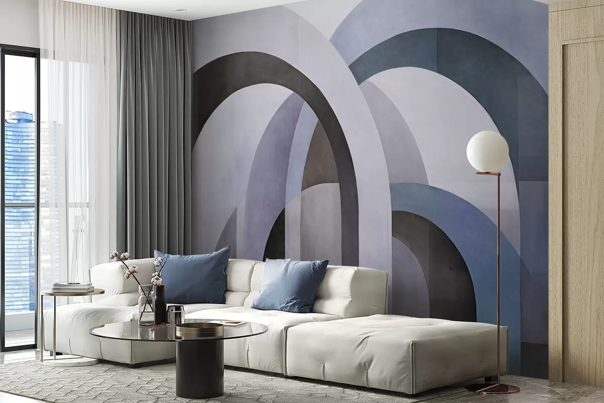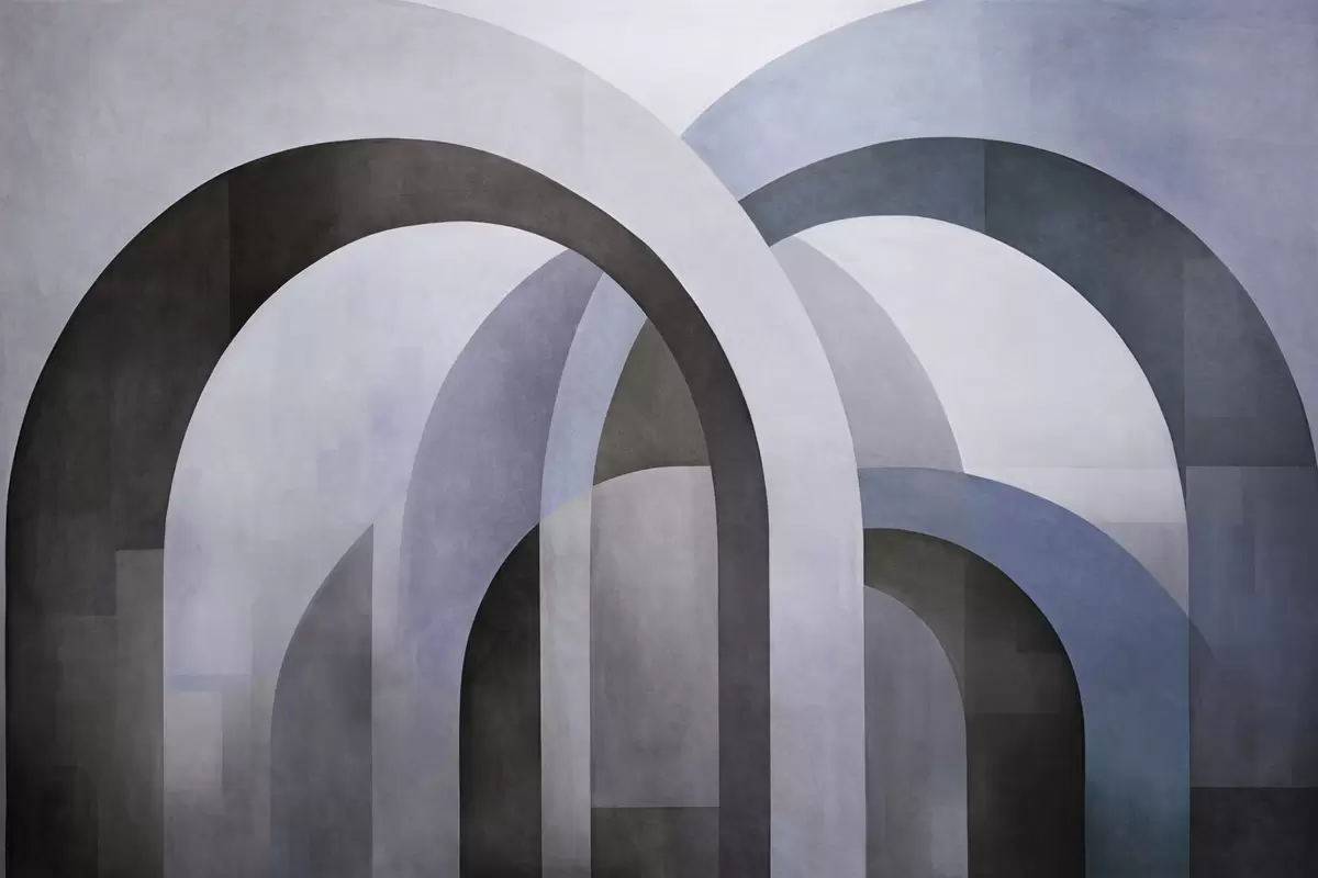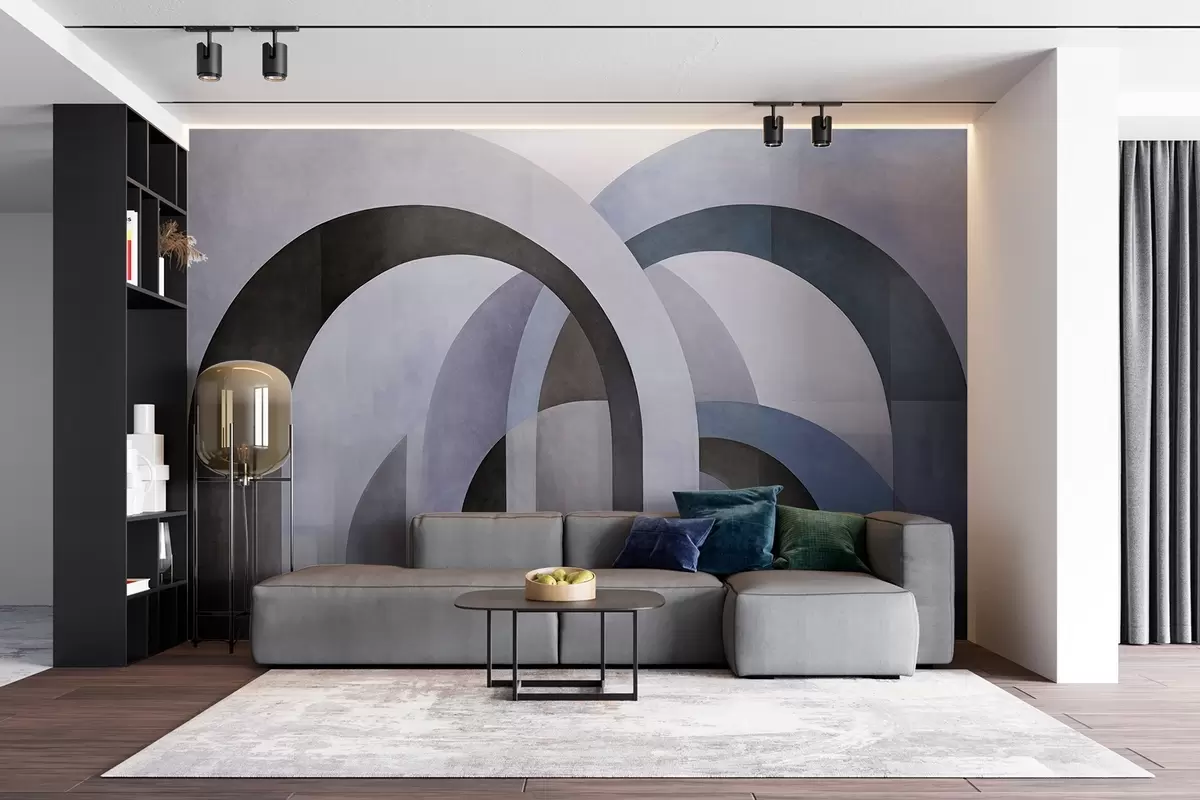 Carta da parati Archi geometrici astratti con texture nei toni del blu, nero e grigio, un design architettonico moderno e stratificato. nr. w09611v1