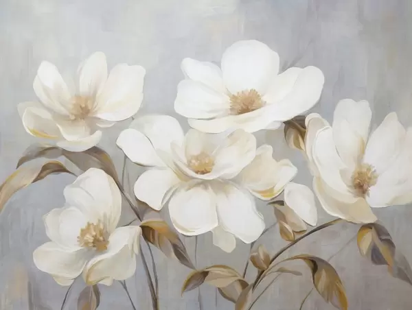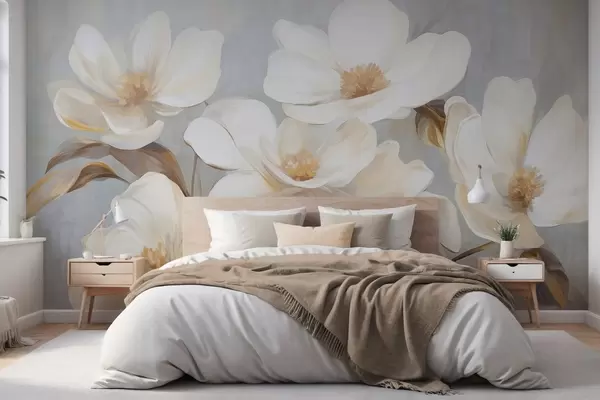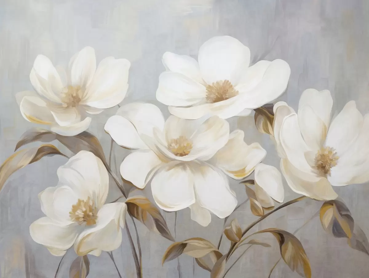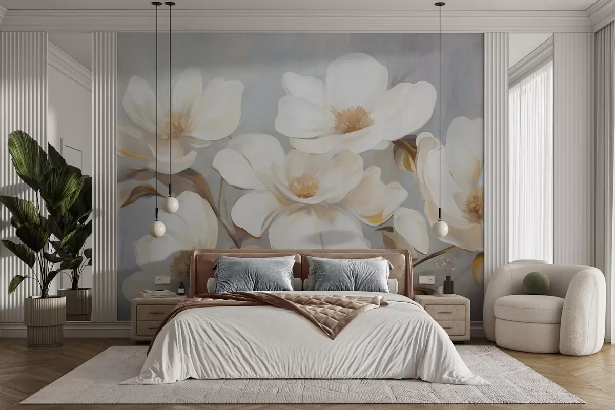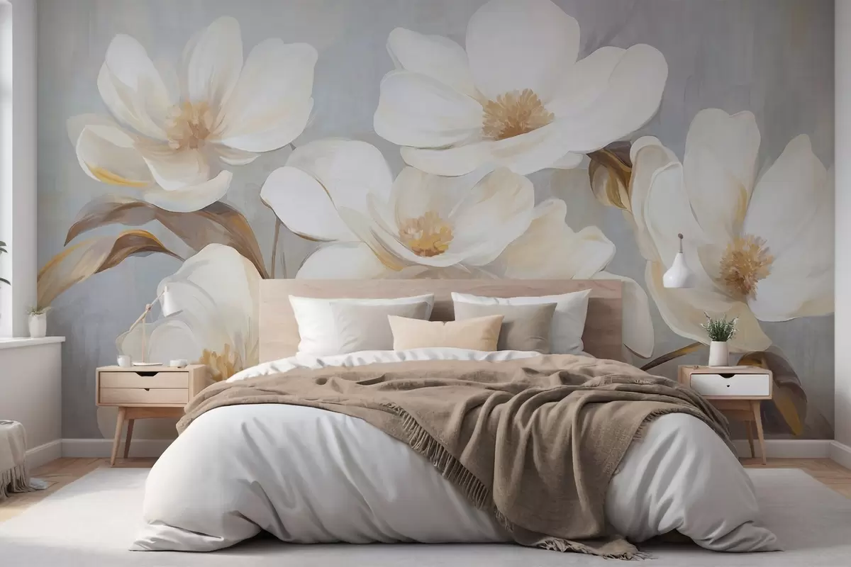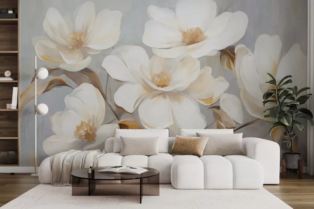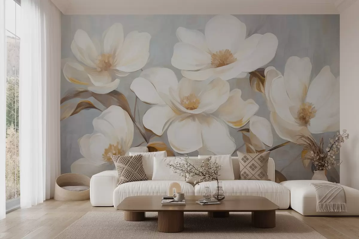 Carta da parati Una pittura materica che imita diversi fiori di magnolia bianchi su uno sfondo pastello tenue. nr. w09612
