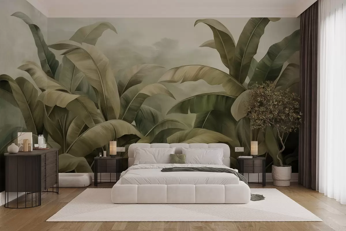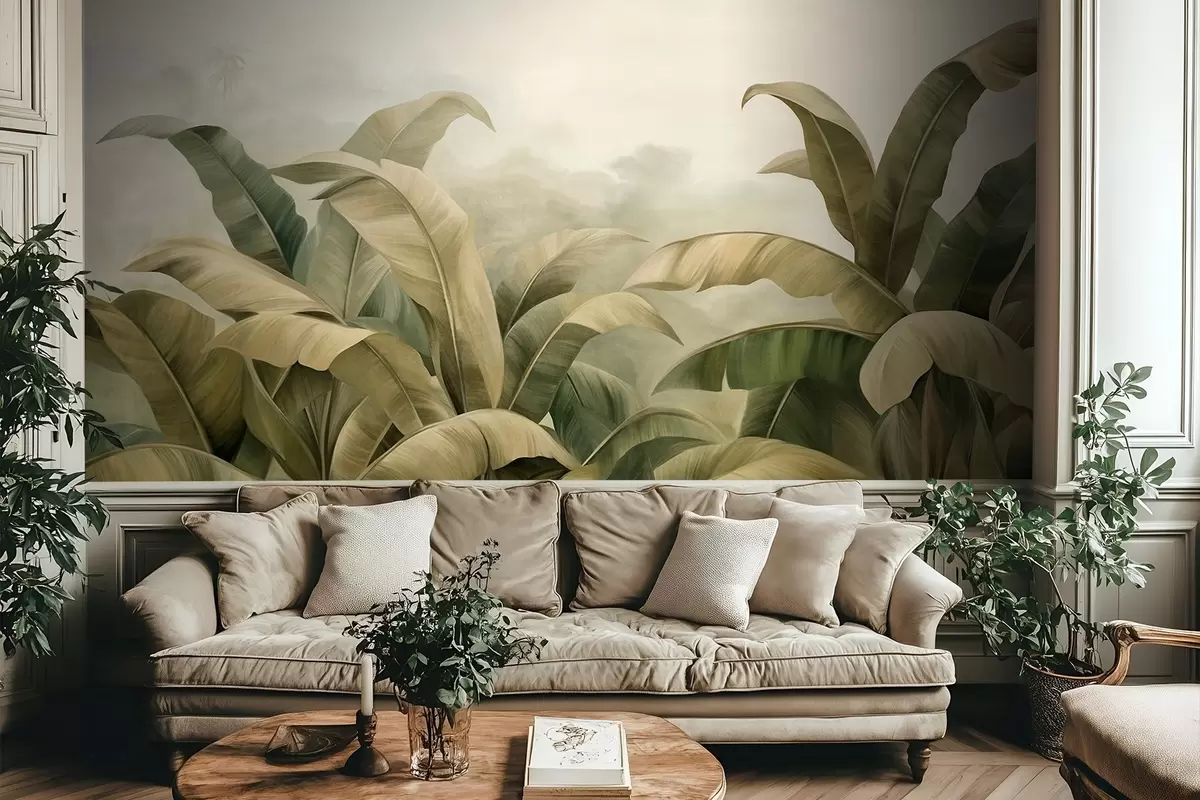 Carta da parati Paesaggio giungla denso e strutturato con grandi foglie di banano nei toni tenui del verde e del beige nr. w09613
