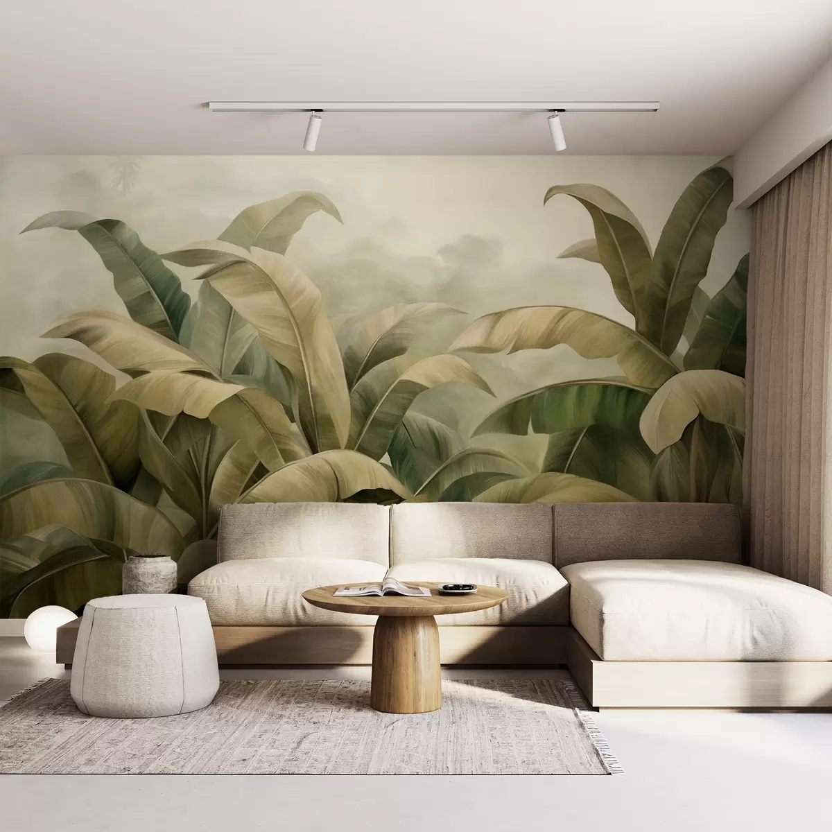 Carta da parati Paesaggio giungla denso e strutturato con grandi foglie di banano nei toni tenui del verde e del beige nr. w09613